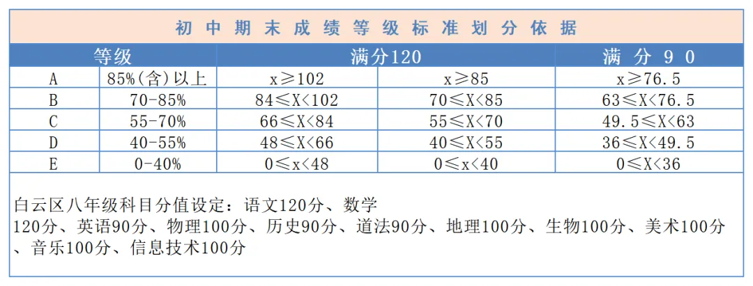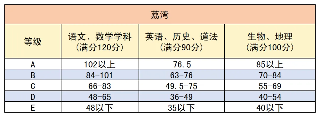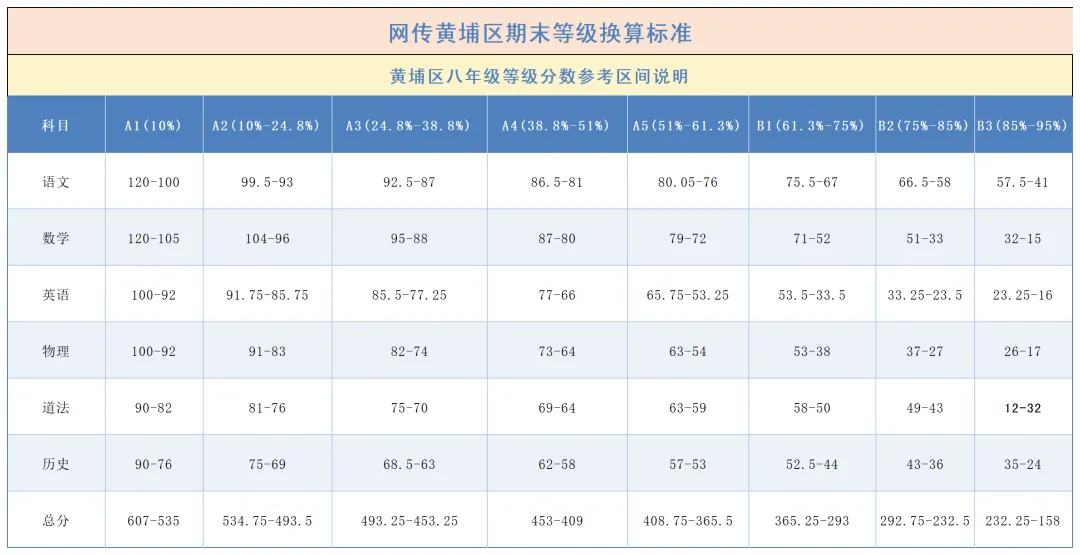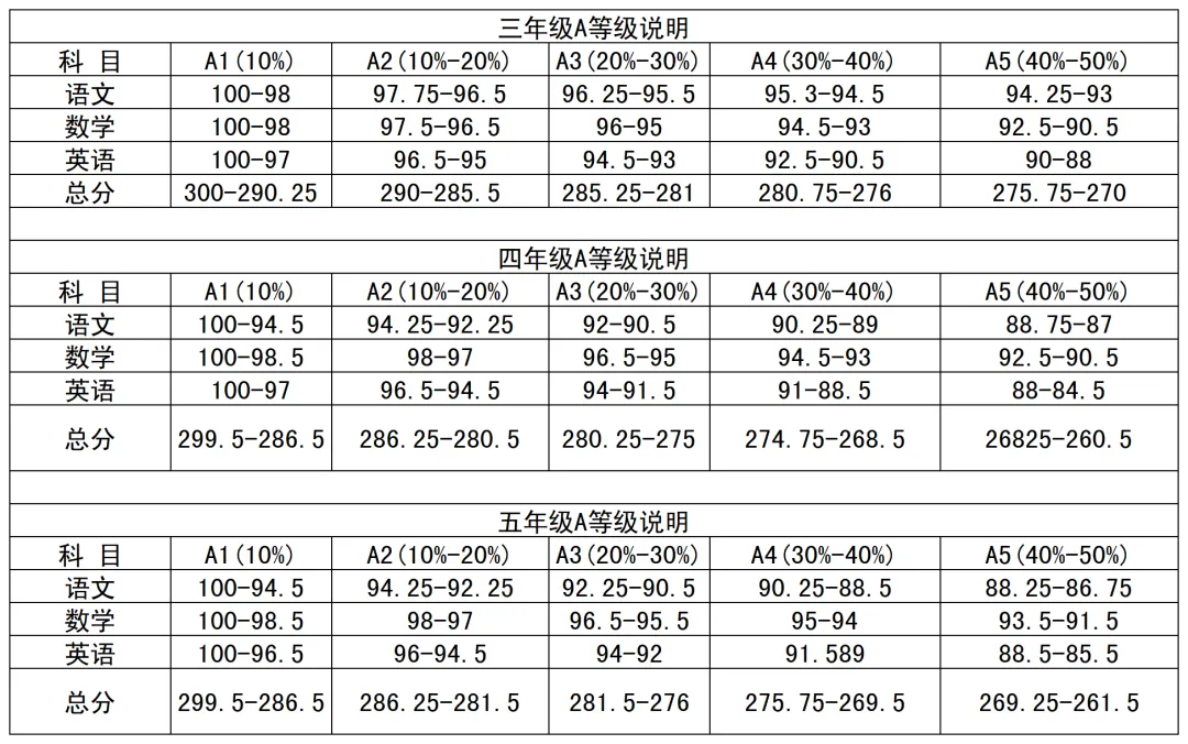 第一步:先对照所在区 / 学校等级标准,结合孩子的等级,锁定各科分数区间;