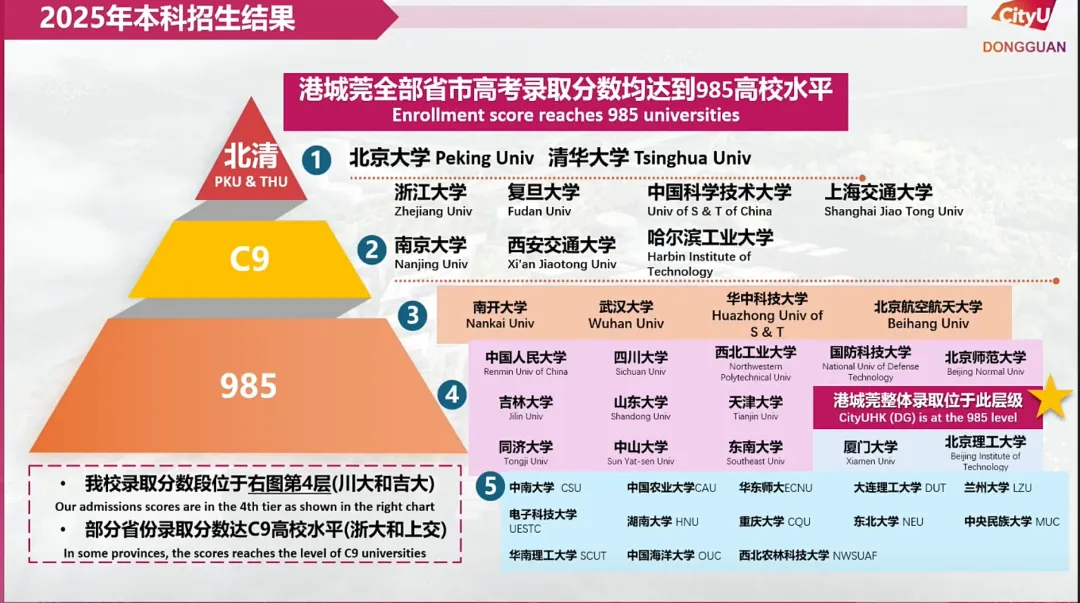 香港城市大学(东莞)2025年本科录取分数整体对标985,在部分省份,录取分数甚至达到C9高校水平(如浙大、上交),在全国高校录取分数层级中,位于第4层,与四川大学、吉林大学相当。