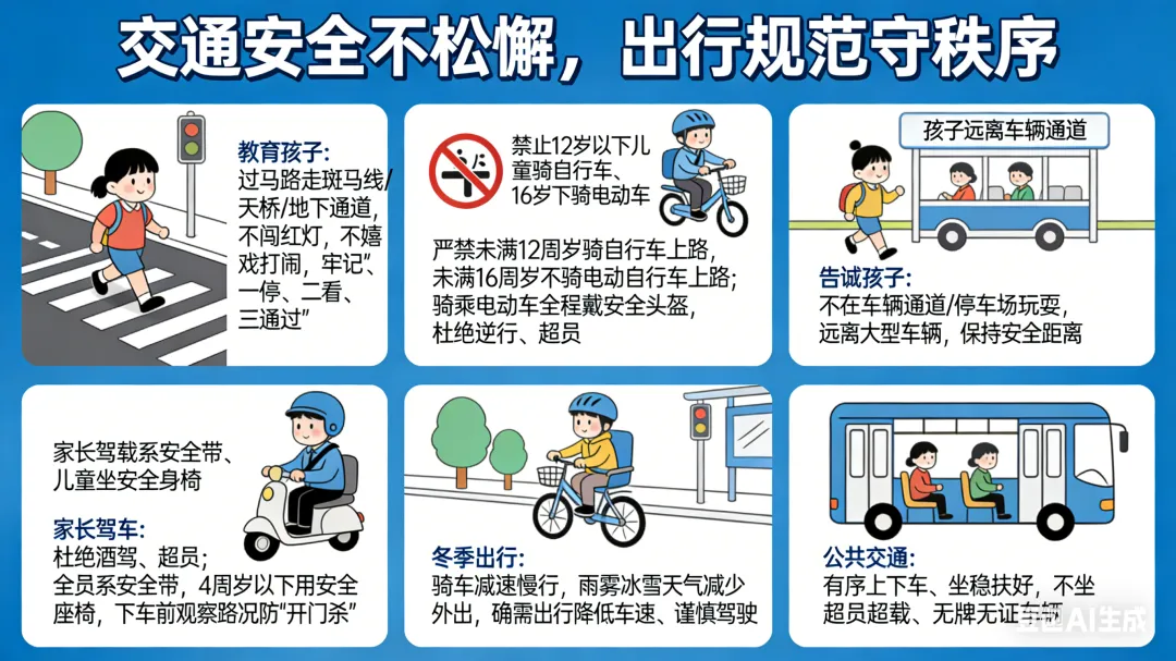 2. 严禁未满12周岁孩子骑自行车上路,未满16周岁不骑电动自行车上路;骑乘电动车须全程规范佩戴安全头盔,杜绝逆行、超员等危险行为。