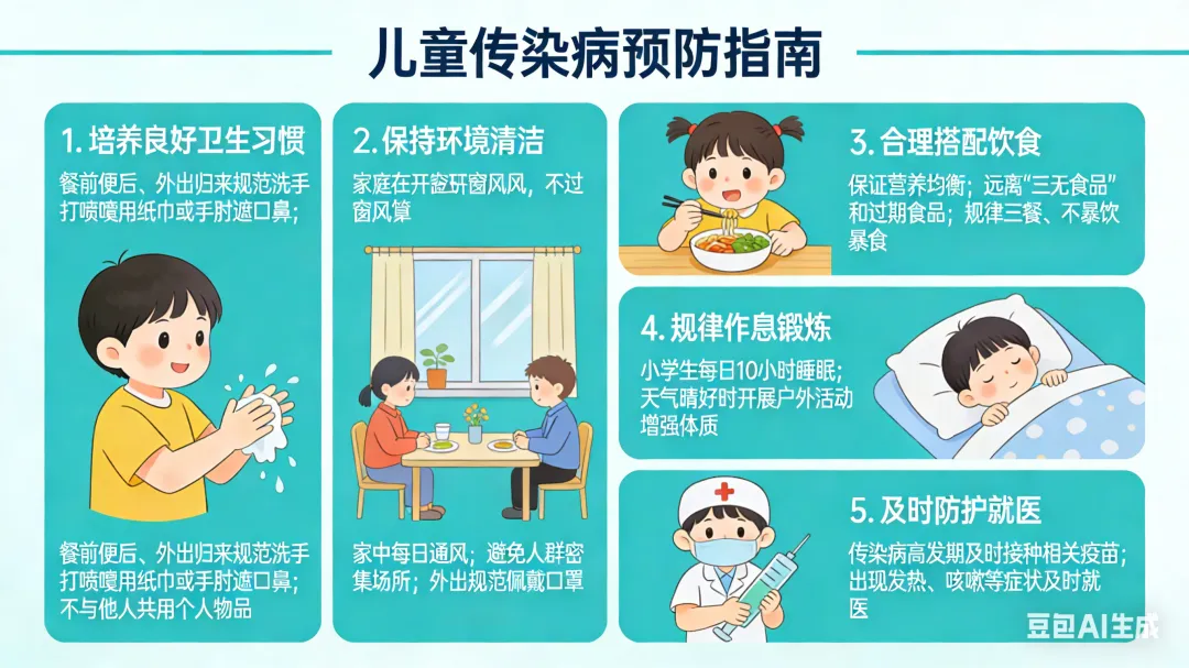 1. 培养孩子良好卫生习惯,餐前便后、外出归来规范洗手,打喷嚏时用纸巾或手肘遮掩口鼻,不与他人共用个人物品。