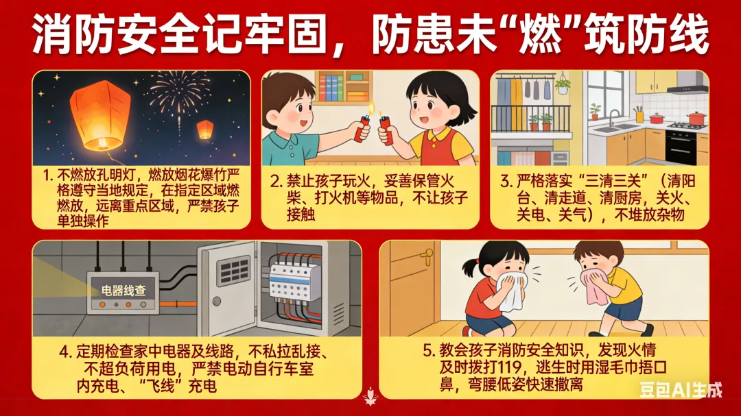 5. 教会孩子消防安全知识,发现火情及时拨打119,逃生时用湿毛巾捂口鼻,弯腰低姿快速撤离。