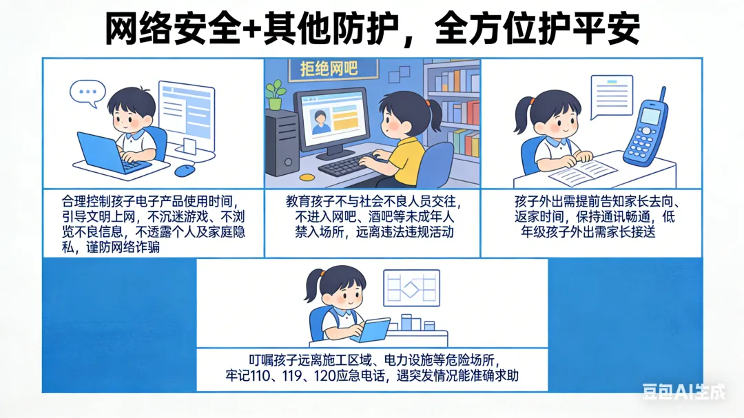 1. 合理控制孩子电子产品使用时间,引导文明上网,不沉迷游戏、不浏览不良信息,不透露个人及家庭隐私,谨防网络诈骗。
