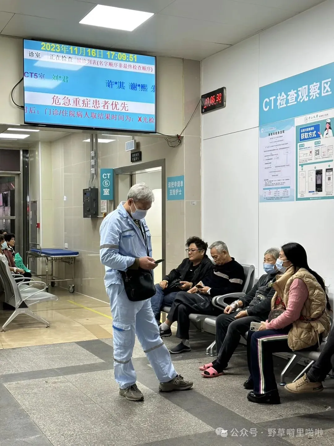 下午,去急诊,验个血,听个肺,排除一下其他问题。打车十几分钟就到了中山三医院,急诊的前台护士问了我的情况,根据信息给了张挂号的分类纸条,家属拿着纸条去另外的窗口缴费。挂号费21元。4171号。提示牌这时已经喊到4161了。