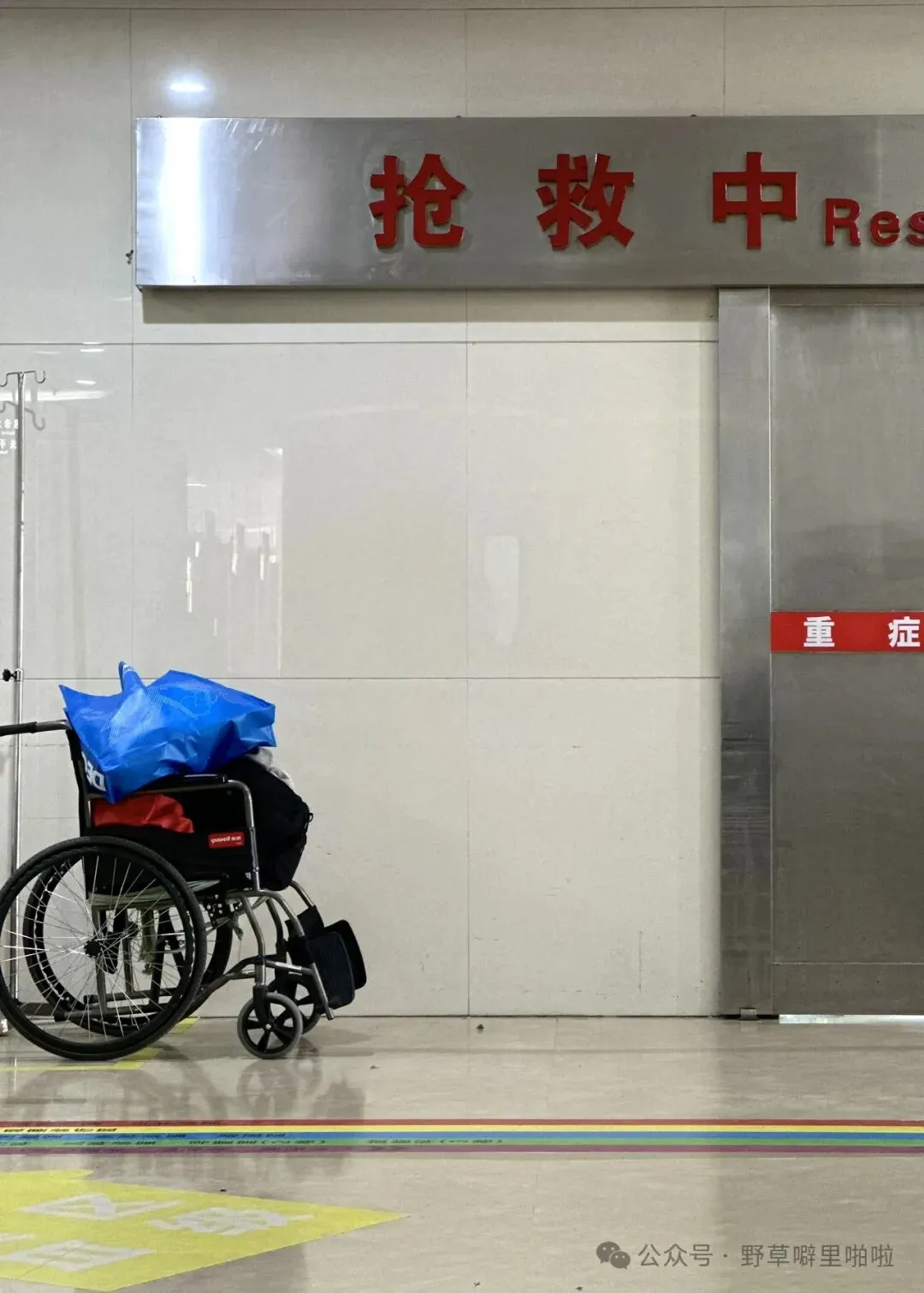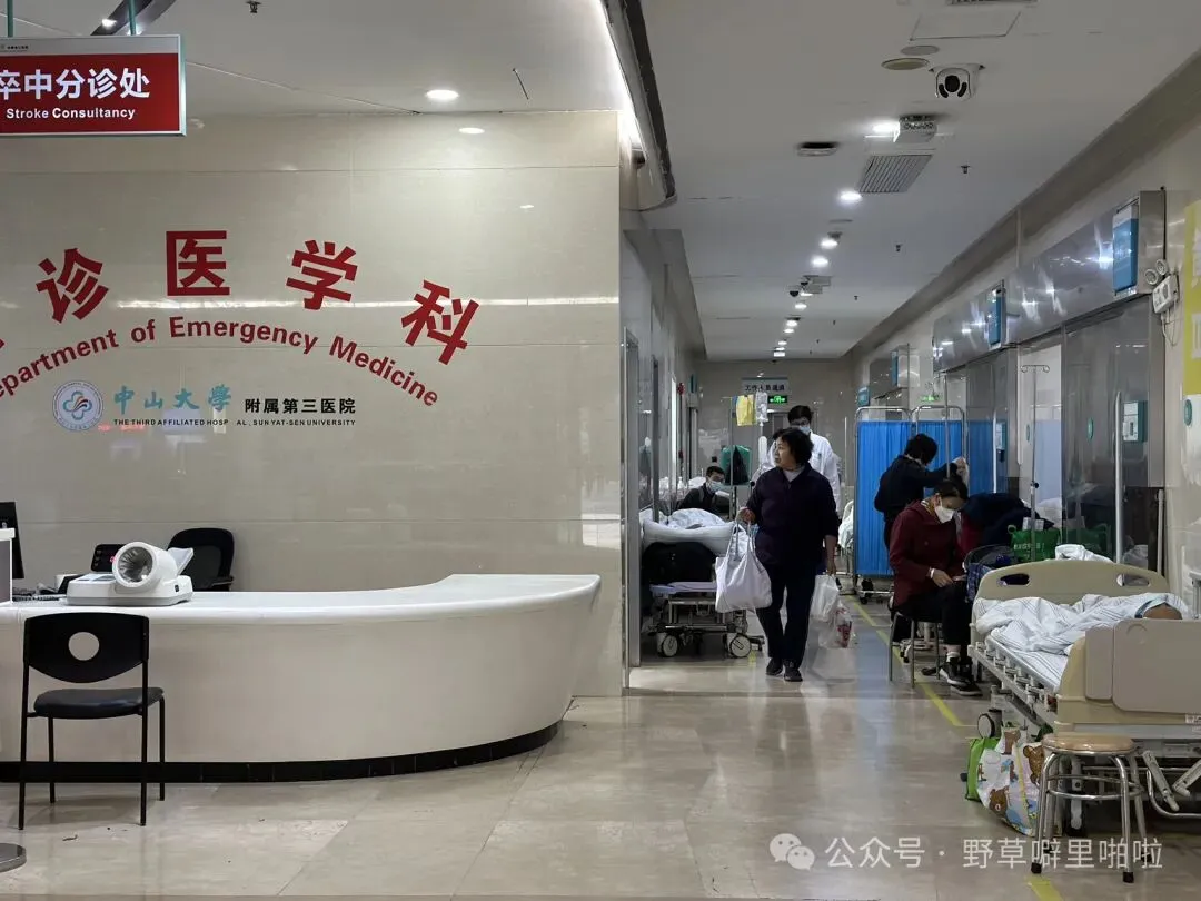 整个急诊区域不大,由候诊大厅和两个走廊组成。两个走廊,一个是就诊区,一个是抢救区。抢救区附近摆了一些临时病床,上面躺了些病人。有个小型等候区,病人们坐那等语音提示,另有个玻璃隔断围合成输液区。就诊区有3个内科诊室、4个儿科诊室,另外有胸痛、卒中诊室。排队等候的过程中,3个内科诊室一度没了医生,其中一个诊室挂了“医生去抢救”的提示牌。