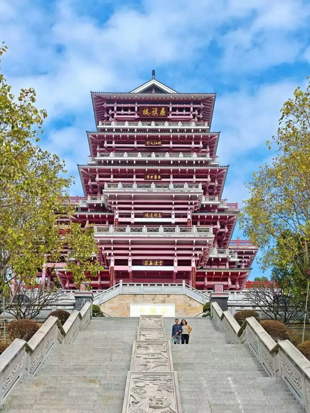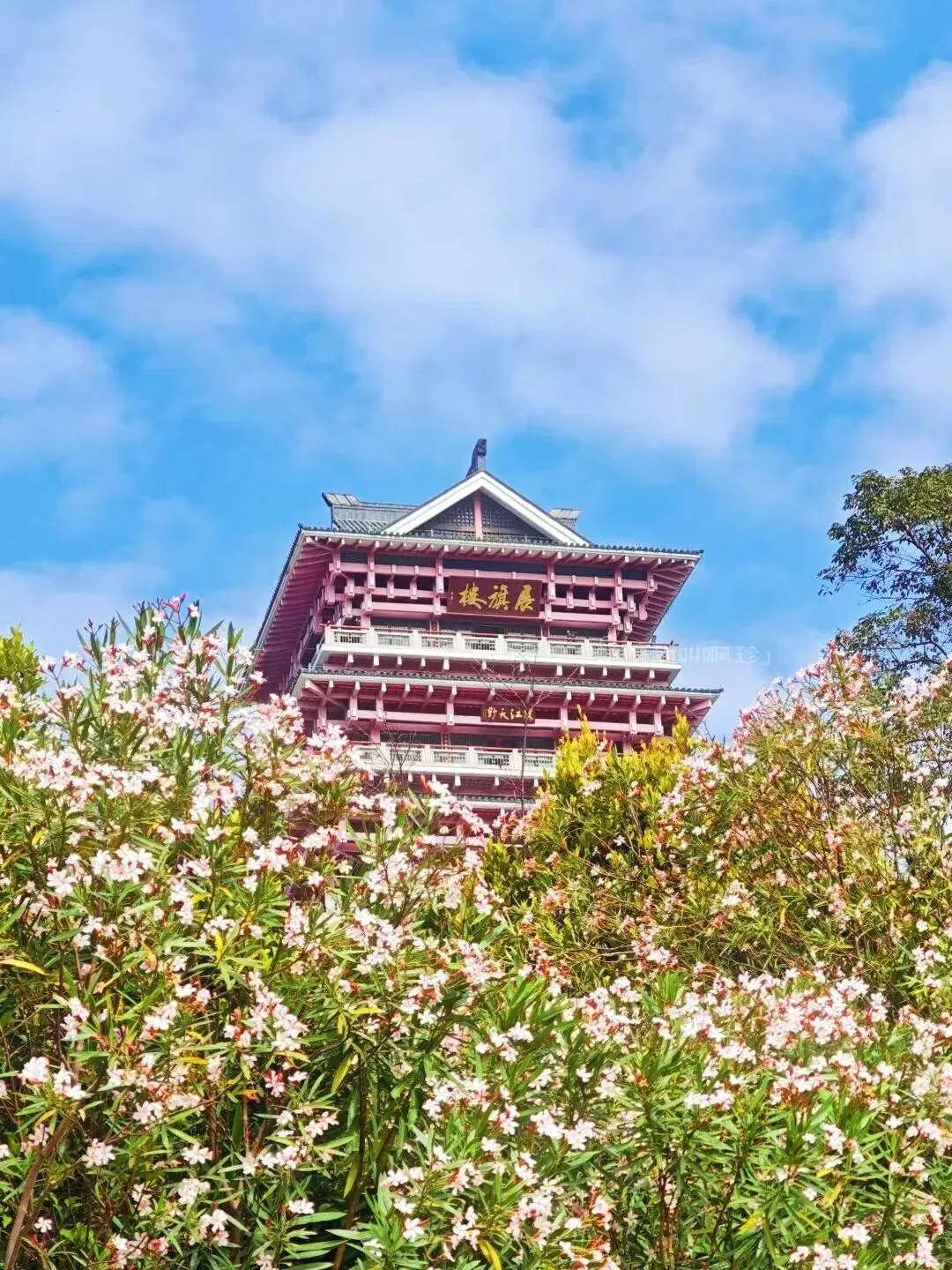 展旗楼太值得细细品味了!融合宋明楼阁风格与岭南特色,49.85米高的七层建筑,中国红主色调在绿意映衬下格外亮眼,比图片里震撼百倍。