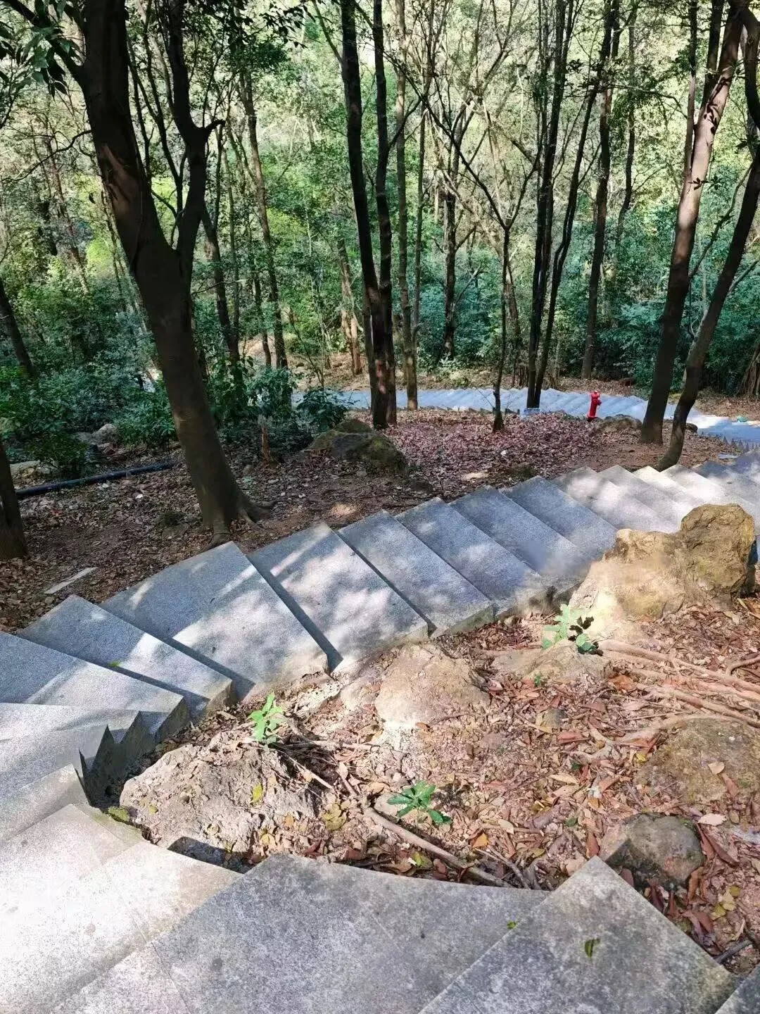 如果只想直奔展旗楼,东门有观光车可直达山顶,10元/人省时省力。中途还能转入石阶步道,这条小路如同抛落的丝绸,柔缓地铺在森林中,穿过树根盘结的坡地,垂入溪谷深处,静谧又治愈。