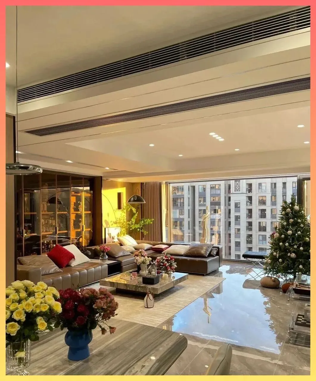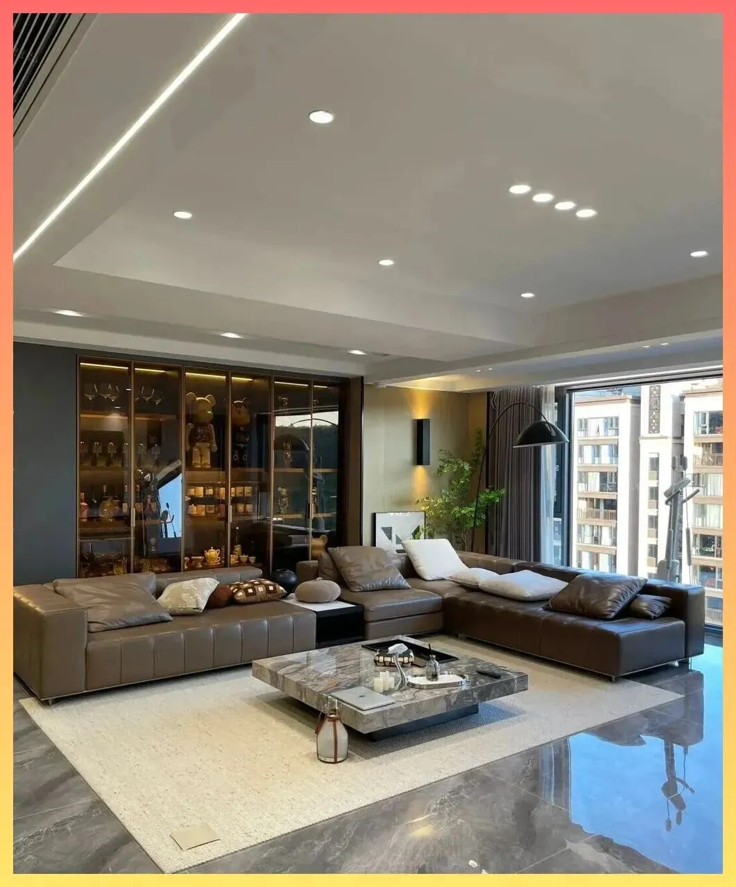 但.她.很.聪明,利.用大面积的采光和.暖色调的.皮质沙发,完美中和了地面的冷感。