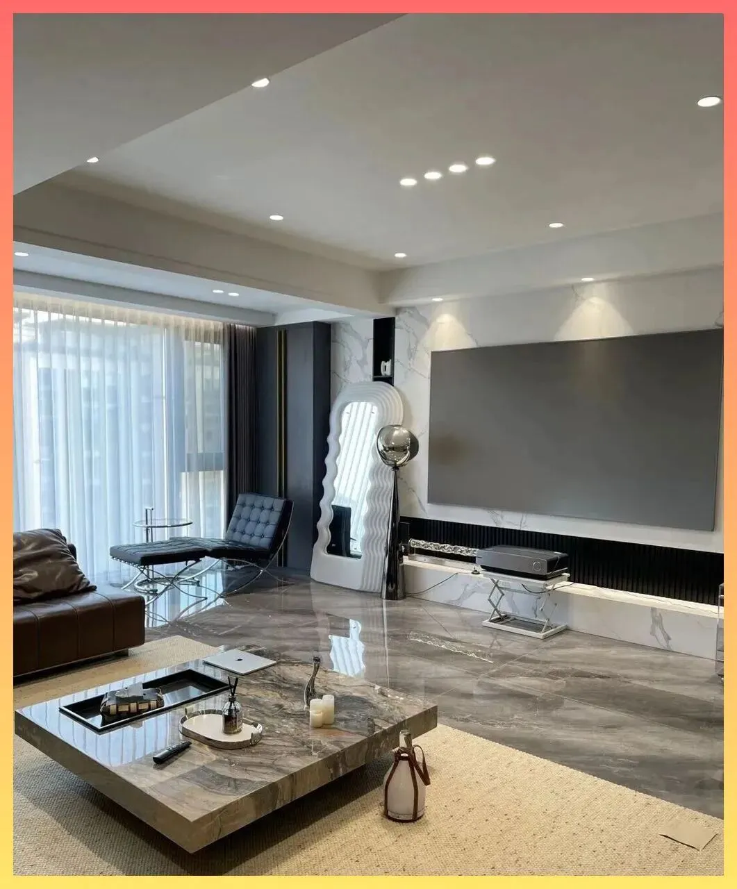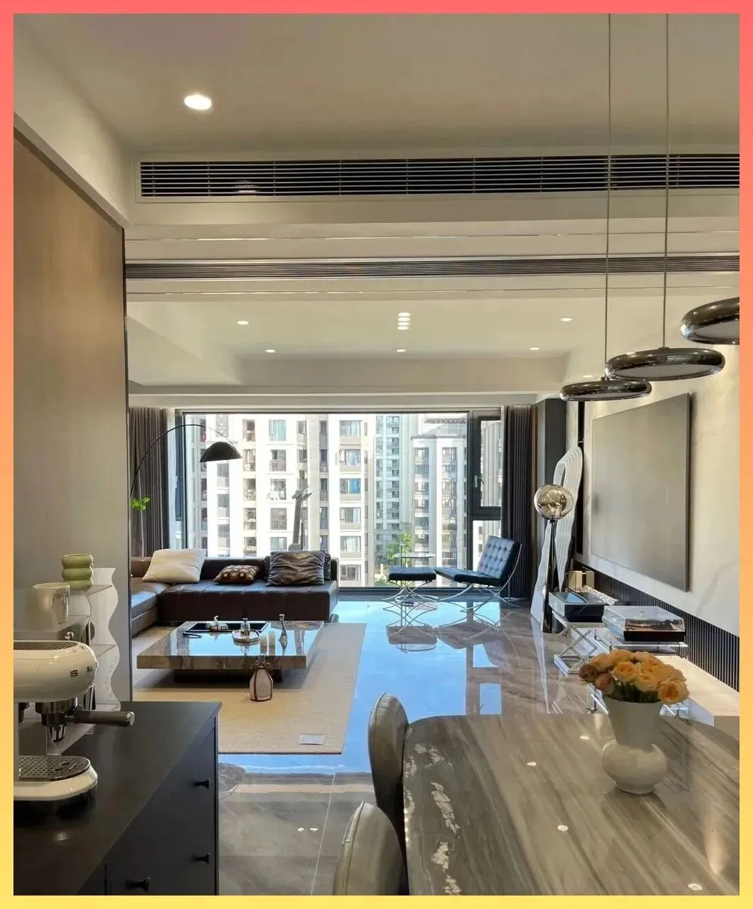 第一眼.看到.这个客厅,你绝对会被地面的.光泽感吸引。