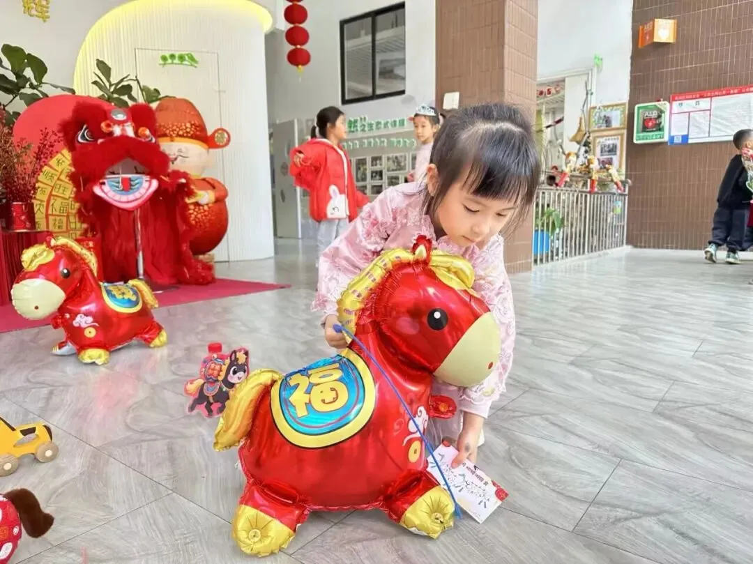 随后的 “小马欢腾游园会”成为孩子们的欢乐盛宴。三个园区结合自身特点设计了丰富多样的趣味活动:仙湖园区以个人为单位挑战关卡,穗东园区以班级为单位协作闯关,阳光园区则采用 “大带小” 结对模式,大班哥哥姐姐牵手小班、中班弟弟妹妹共同参与挑战。孩子们背着游戏挎包,凭游戏卡穿梭于各个游戏点,完成任务后收获印章,现场充满了欢呼与喝彩。