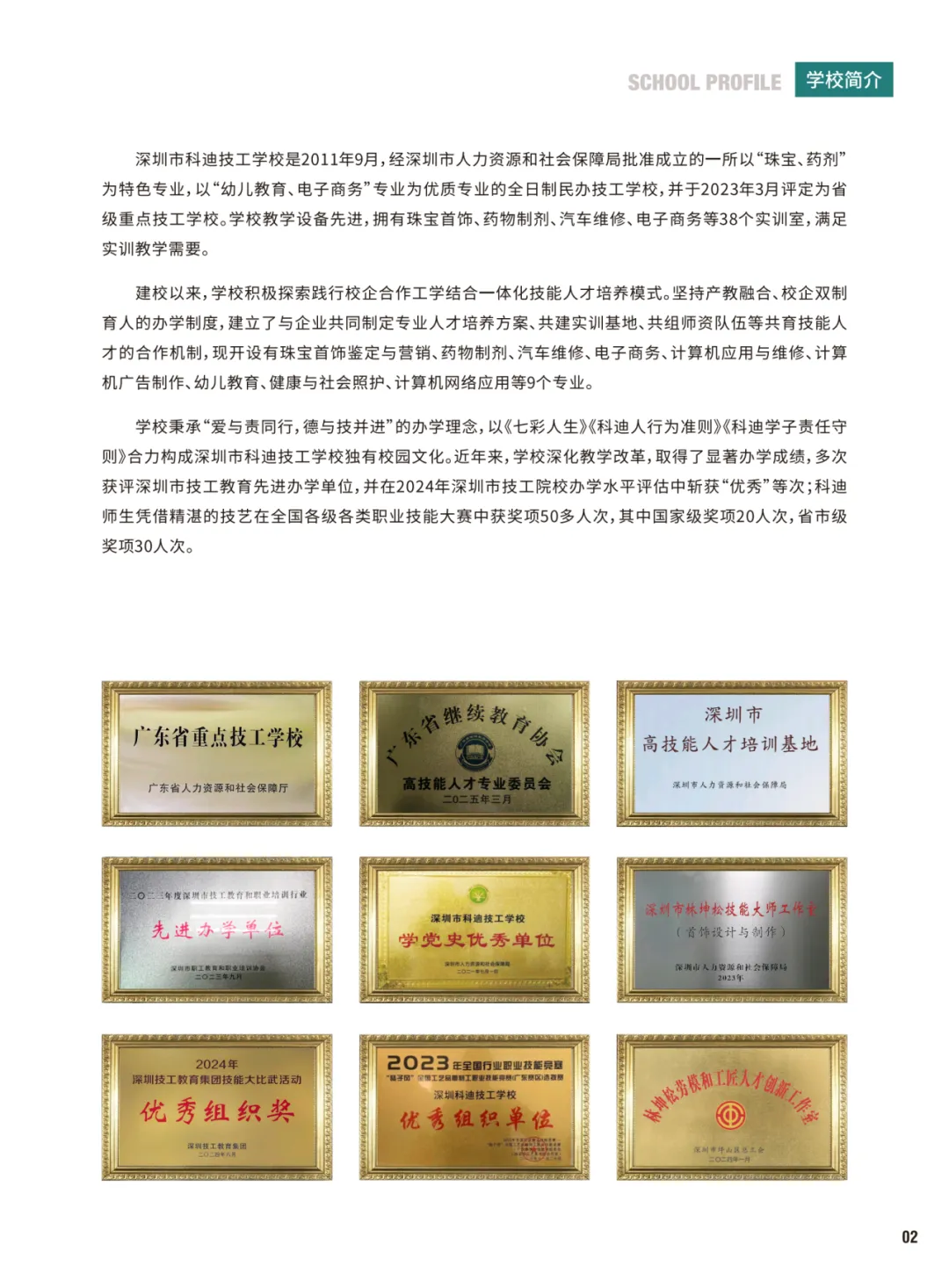 深圳市科迪技工学校 2011 年获批设立,是坪山区民办省级重点技工学校,占地 3.62 万平方米,在校生 2628 人,教职工 205 人,双师型教师占比高,设珠宝首饰鉴定与营销等 9 个专业,珠宝、药剂为省级特色专业。校内建 38 个高标准实训室,实训面积近万平米,拥有珠宝领域市级技能大师工作室。与周大福、国药集团等超百家企业合作,推订单培养模式,毕业生就业率连续五年超 92%,特色专业供不应求,同时搭建中高技对接、3 + 证书高考等多元升学通道。