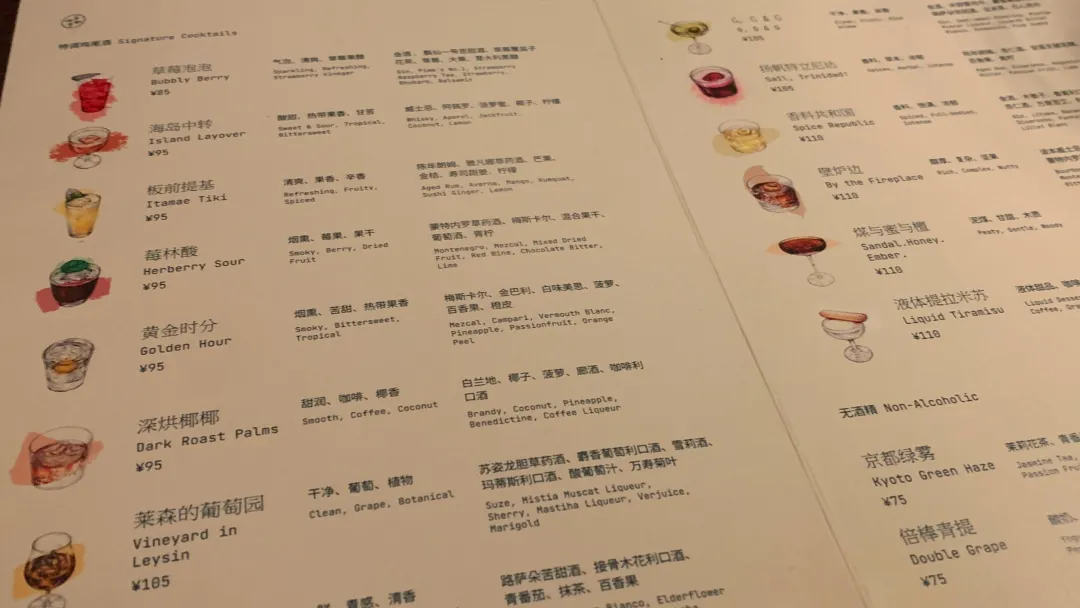 清吧的灯光调得很低,酒保拿着调酒器轻晃,冰块碰撞的脆响,混着舒缓的爵士,漫在温暖的空气里。同伴们坐在长桌前,目光落在酒单上那些带着诗意名字的鸡尾酒上。