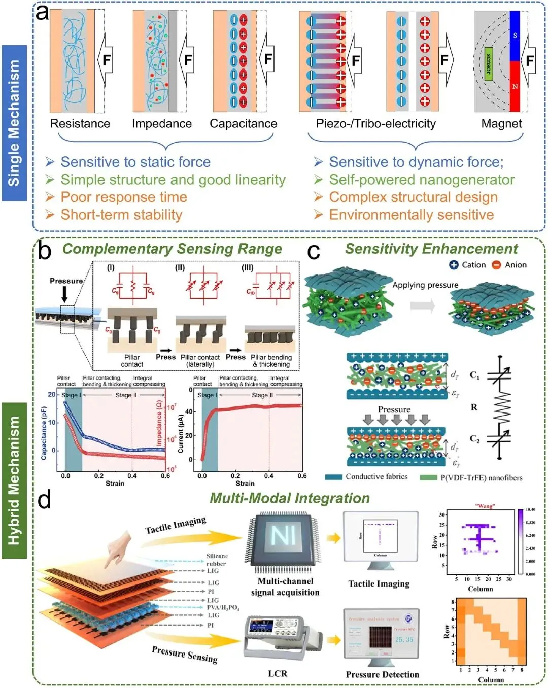 EMA 是柔性阵列传感技术的核心,其设计逻辑基于构建周期性空间排列的单个传感单元,利用单元对力学刺激的差异化响应,精准捕获压力、应变、扭矩等力学信号的空间分布和动态演化。根据载荷特性和能量转换机制,EMA 传感机制可分为静态力响应、动态力响应和混合 / 复合机制三类。静态力响应机制适用于持续机械载荷检测,核心是通过诱导传感材料或结构的几何参数或电学特性变化,建立外力与电阻、电容等电学参数的稳定定量关系。其中,电阻 / 阻抗传感基于力致电阻变化原理,结构简单、成本低、灵敏度可调,但存在温度交叉敏感性和长期稳定性不足等问题;电容传感基于平行板电容器模型的力致参数变化,具有低功耗、响应速度快、稳定性好等优势,但其面临边缘效应和布线干扰的挑战。动态力响应机制针对周期性波动或瞬态冲击类机械载荷,核心是通过力致材料极化或界面电荷转移,实现机械能向电能的动态转换,输出脉冲或周期性交流电信号,可实现无外接电源的自供能检测。摩擦电传感基于摩擦起电效应和静电感应,具有自供能、灵敏度高、材料选择灵活等特点,但输出稳定性易受环境温湿度影响;压电传感利用压电效应直接将力学信号转换为电信号,响应速度快、输出稳定、抗电磁干扰能力强,但在机械柔韧性和压电性能之间存在固有权衡;磁电传感依赖磁致伸缩 - 压电耦合或磁通量变化产生的电磁感应,信号信噪比高、具有频带选择性,适用于特定环境下的非接触传感。混合 / 复合机制 EMA 在单一器件结构中集成两种或多种不同传感原理,旨在克服单一机制的固有局限,实现全面的多模态数据采集,可分为互补范围扩展、灵敏度增强耦合和多模态功能集成三类架构。3.1.2 EMA 核心材料