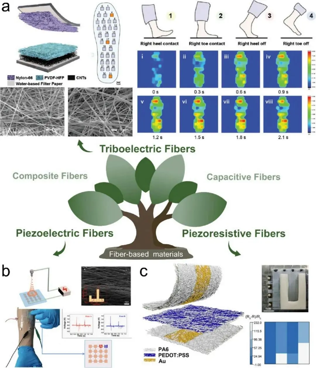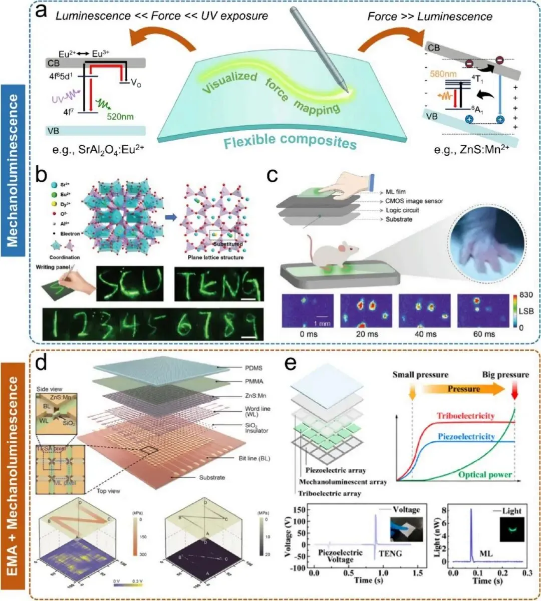 图 1、柔性力学映射的传感 - 传输 - 计算 - 集成范式示意图。该集成框架从左至右涵盖多种应用,包括电子皮肤和光子皮肤、穿戴式医疗、软体机器人、智能监测、触觉重建和在体传感。图 2、EMA 主要传感机制示意图。(a) 静态和动态力响应机制对比;(b) 电容和电阻混合机制提升传感器检测范围;(c) 电容和压电混合机制增强灵敏度;(d) 集成摩擦电 - 电容复合阵列用于多模态触觉传感。图 3、凝胶基传感材料示意图。(a) 压电离子水凝胶的结构及 4×4 传感器阵列在多点压力下的电压响应;(b) 具有双连续网络结构的离子凝胶用于电容式触觉传感;(c) 具有多层交联孔隙结构的超弹性石墨烯气凝胶及其在 3×3 阵列配置中识别动态力轨迹的能力。图 4、静电纺丝制备的纤维基材料示意图。(a) 基于尼龙 - 66 和 PVDF-HFP 纳米纤维的高密度摩擦电压力传感器阵列设计,用于动态足底压力映射;(b) 在岛 - 桥电极上利用 PVDF-TrFE 纳米纤维构建的自供能压电传感器阵列示意图;(c) 由导电 PEDOT:PSS 和弹性 PA6 组成的多层全纳米纤维压阻传感器结构,能够高空间分辨率检测轻质物体。图 5、MXene 基传感材料的多维架构示意图。(a) MXene 的手风琴状形貌;(b) 核 - 壳结构 CB/PDMS/MXene 纱线及其集成到智能纺织品阵列中用于空间压力分布和手势识别;(c) 具有层压结构的纤维素 / MXene 集成触觉阵列,可减轻应力集中;(d) 层状二氧化硅纳米纤维 / MXene 气凝胶,能够解耦压力和温度信号,用于高级人机交互。图 6、机械 - 光学传感(MOS)的机制和材料示意图。(a) 应变诱导的颜色演变和表面晶格共振用于定向应变映射;(b) 柔性太赫兹 Mie-tronic 传感器的架构和工作原理;(c-f) 通过超表面的振幅和相位差进行应变映射。图 7、机械发光(ML)传感器的功能原理和混合架构示意图。(a) 柔性 ML 复合材料在机械载荷下将应力直接转换为可见光的示意图;(b) 通过 SrAl₂O₄:Eu²⁺, Dy³⁺/PVDF 复合材料实现动态力的可视化;(c) 通过 CMOS 集成的 ZnS:Cu/PDMS 薄膜实现小鼠足迹的微应力映射;(d) 结合摩擦电和 ML 元件的双模传感器矩阵,用于宽范围压力映射;(e) 集成摩擦电、压电和 ML 传感层的自供能多模态智能皮肤,实现 0-130 MPa 范围内的交叉验证应力检测。图 8、EMA 系统空间分辨率提升策略示意图。(a) 用于抑制串扰的水平、垂直和先进交替布线架构;(b) 毫米和亚毫米级空间分辨率的最新研究成果;(c) 脉搏波监测和分析中的高分辨率生物医学应用。图 9、EMA 的信号采集、传输和预处理示意图。(a) 抑制串扰的电阻阵列读出电路示意图和工作原理;(b) 电容阵列的电荷域传感器内计算框架;(c) 用于高保真 TENG/PENG 信号表征的先进差分前端架构;(d) 无线传输技术对比雷达图;(e) 核心信号预处理阶段的流程示意图。图 10、信号解码和智能分析的人工智能驱动策略示意图。(a) FMM 系统中的计算流程概述;(b) 类生物 3D 电子皮肤用于力学量和材料特性的高保真时空重建;(c) 基于柔性 PZT 传感器阵列的语音识别流程,展示将时间序列数据转换为二维光谱特征图用于 CNN 分类;(d) 利用磁弹性传感器阵列捕获的按键动力学进行用户认证系统,突出时间域特征提取和分类器性能。图 11、人工智能赋能的高级信号处理策略示意图。(a) 用于触觉超分辨率的传感器内计算架构;(b) 基于稀疏磁场测量的物理知情重建;(c) 通过自适应脉搏波分析提取生理信息;(d) 利用自供能智能鞋垫进行步态识别;(e) 用于纹理分类的类生物触觉传感器;(f) 通过摩擦电传感和迁移学习实现车辆 - 道路相互作用监测,用于路况识别。图 12、高保真多模态传感集成策略示意图。(a) 融合力学和热刺激的人体触觉感知示意图;(b) 利用离子导电水凝胶阵列进行高分辨率温度映射;(c) 基于还原氧化石墨烯的可拉伸热传感器;(d) 集成温度和压力传感功能的热稳定电子纺织品;(e) 共集成触觉、接近度、湿度、磁性、气体、环境光和加速度传感的柔性模块化系统。图 13、植入式和在体传感技术示意图。(a) 用于神经和力学监测的可注射石墨烯基网状结构;(b) 具有无线读出功能的长期皮质表面成像平台;(c) 用于关节力学监测的植入式正压阻传感器;(d) 用于牙科咬合监测的自供能 TENG 阵列;(e) 用于无线咬合力传感的近红外 - 机械发光(NIR-ML)技术;(f) 用于多模态咬合分析的光学护齿套;(g) 电和光学 FMM 传感模态的系统对比。图 14、智能闭环触觉系统示意图。(a) 用于轻量化触觉处理的近传感器模拟计算;(b) 用于三维触觉重建的类生物指尖;(c) 用于形状显示的可重编程 3D 超表面;(d) 结合形状变化和振动反馈的可重构触觉界面。六、作者信息