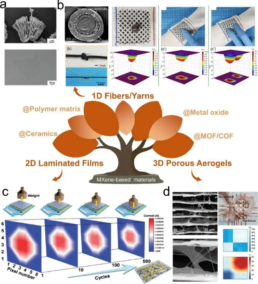 EMA 的传感性能本质上由组成材料的物理化学性质决定,核心挑战在于实现对力学信号的精准电响应,同时保证高柔韧性、耐久性和皮肤相容性。近年来,EMA 传感材料已从传统金属 / 碳基导电复合材料向更复杂的功能复合材料发展。凝胶基材料是下一代柔性传感的重要一类,包括水凝胶、离子凝胶、气凝胶等。水凝胶是典型的离子导体,适用于电容传感和新兴的压电离子传感;离子凝胶通过聚合物网络溶胀非挥发性离子液体,解决了水凝胶的脱水问题,同时具有优异的热稳定性和电化学稳定性;气凝胶则通过在骨架中引入石墨烯、碳纳米管等导电纳米填料,具备超轻、高孔隙率的特点,是高灵敏度压阻传感的理想选择。纤维基传感材料以一维纤维为基本构建单元,通过静电纺丝、湿纺、熔纺等工艺制备,具有固有柔韧性、优异的可编织性和透气性。其中,摩擦电纤维传感器利用接触起电和静电感应耦合效应,压电纤维传感器依赖纤维结构内偶极子极化,压阻纤维传感器则基于导电网络内的接触电阻变化,均可通过合理设计实现特定力学信号的高灵敏度检测。MXene 基柔性传感器作为新型二维过渡金属碳化物、氮化物或碳氮化物,具有金属导电性、亲水性表面化学和大比表面积等优势。其特征性的手风琴状形貌提供了丰富的电化学相互作用活性位点,可与聚合物、陶瓷、金属氧化物等多种基质无缝组装。研究通过构建一维、二维、三维层级结构,优化机电界面,实现空间分辨传感,在可穿戴设备、多模态传感等领域展现出巨大潜力。3.1.3 机械 - 光学传感(MOS):互补路径