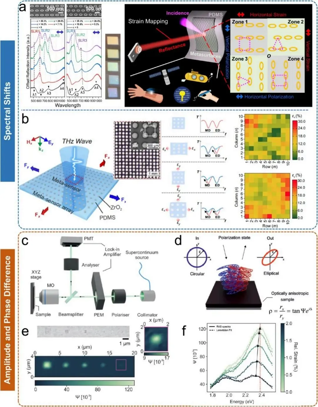 尽管 EMA 技术已相当成熟,但在追求更高性能时面临密集布线网络带来的信号串扰和亚微米分辨率下制造成本攀升等根本性挑战,促使 MOS 作为柔性分布式力学映射的创新路径应运而生。MOS 的核心原理是通过机械载荷定量调制反射光谱、发光强度、偏振态等光学信号,直接可视化力学场分布,从根本上消除物理布线以避免串扰,实现接近光学衍射极限的空间分辨率,并具备原位可视化能力。基于能量转换机制,MOS 策略可分为两类:一是被动光子调制,机械变形通过改变人工纳米结构的几何形状,调制入射光的振幅、相位或光谱;二是主动机械发光(ML),机械应力直接激发材料带隙内的载流子,产生光子发射。超表面作为被动 MOS 的核心架构,通过在柔性弹性体基底上嵌入周期性纳米结构,利用应变诱导的对称性破缺或晶格膨胀,实现光学响应的定量偏移;机械发光材料则通过能带工程和缺陷态调制实现力致发光,无需人工设计微纳结构,在体内传感和黑暗环境监测中具有独特优势。3.2 EMA 的高保真追求:空间分辨率与信号传输