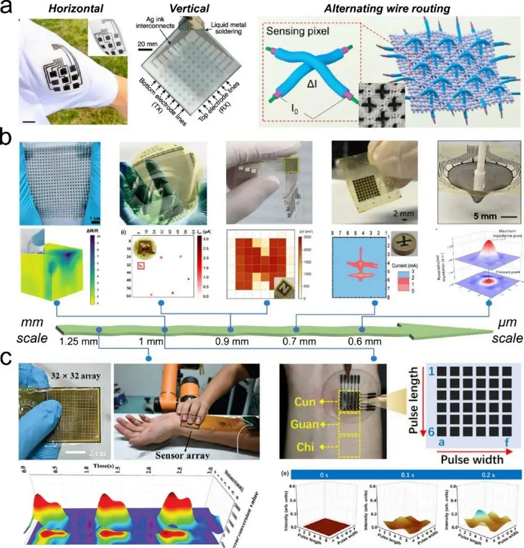 EMA 的空间分辨率定义为区分相邻力学刺激所需的最小距离,是柔性电子皮肤等核心应用的关键性能指标。提升分辨率面临核心权衡:减小单元尺寸和间距理论上可提高空间分辨率,但过度微型化会大幅增加功能层的制造复杂度,并严重影响机械稳健性和信号稳定性。从电学角度看,互连架构是主要限制因素,传统横向互连架构中,布线与传感元件共面,占用宝贵的表面面积,且相邻导线间会产生寄生电容和互感,导致严重的单元间串扰。为应对这一挑战,研究人员采用了创新策略:垂直互连通道策略将导电层和功能层组织成分层的三明治结构,以最小化平面布线拥堵;此外,利用纺丝纤维的可编织性创建交替布线方案,为互连设计提供了新路径,从本质上减少串扰。3.2.2 信号采集、传输与预处理