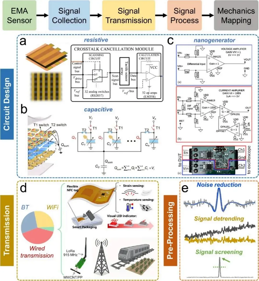 信号传输是连接 EMA 传感器物理响应与最终力学映射可视化的关键桥梁,其性能直接决定整个 FMM 系统的实时性、稳定性和实际适用性。完整的高性能 EMA 信号传输路径包括信号采集、信号传输和信号预处理三个核心且需协同优化的阶段。信号采集的核心任务是通过专用电路将 EMA 单元的力学响应转换为标准化、可处理的电信号,其性能关键依赖于电路拓扑设计与单元特定传感机制的精准匹配。针对电阻 / 电容 EMA 的缓变直流或低频电信号,采集电路以抑制直流漂移和接触电阻干扰为核心设计重点;对于摩擦电 / 压电 EMA 产生的高压脉冲交流电信号,则需要通过整流 - 分压采样电路或电荷积分电路进行高效采集。信号传输的核心功能是将标准化电信号从采集电路传递到后端处理单元,主流传输技术包括有线传输和蓝牙、WiFi、NFC、RFID、LoRa 等无线传输技术。不同传输技术在传输距离、数据速率、功耗和抗干扰性等方面各有优势,可根据具体应用场景选择。原始 EMA 采集信号易受环境温湿度波动、电路噪声、模数转换器量化误差和单元间串扰等多种干扰源影响,需通过专用预处理流程减轻伪影、提取有意义特征。核心预处理流程包括噪声抑制、信号去趋势和信号筛选三个连续阶段,显著降低时间序列数据的冗余度,减轻后续 AI 算法的计算负担,提升分析效率和决策准确性。3.3 人工智能赋能计算:从数据到智能