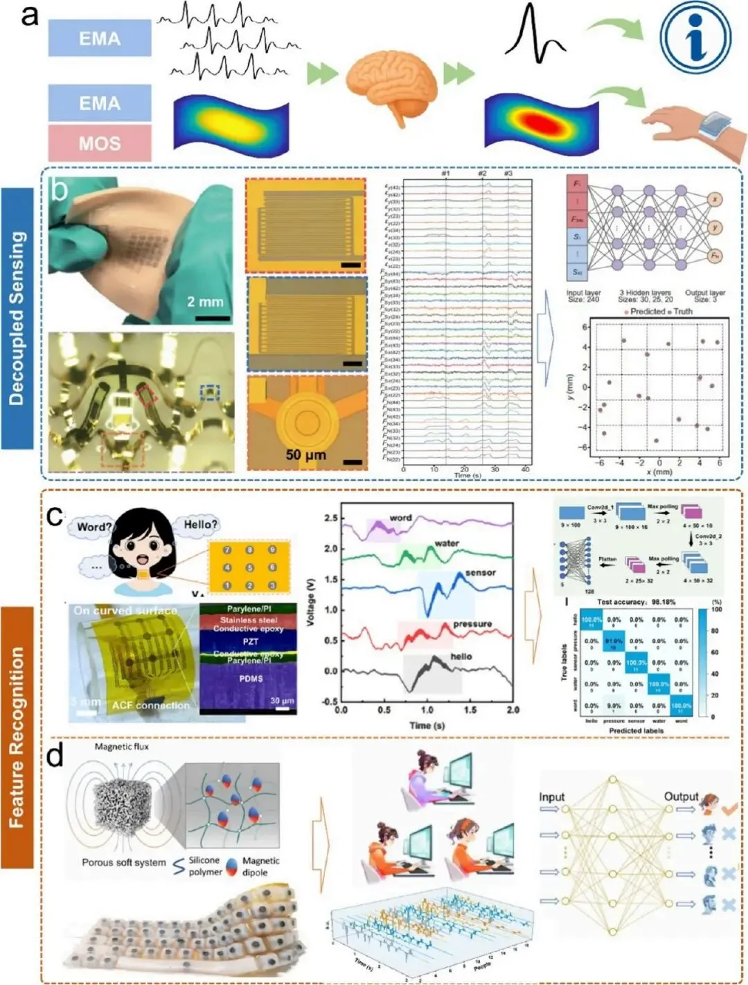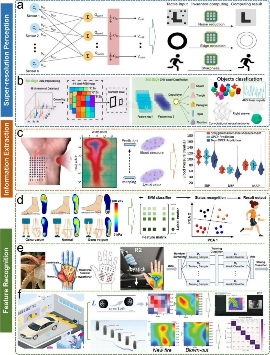 EMA 和 MOS 技术的进步使 FMM 系统能够生成海量的时空耦合力学数据。EMA 系统主要产生多维时间序列信号,这类信号通常包含冗余信息且被复杂背景噪声掩盖;MOS 系统以及转换为视觉格式的高密度 EMA 矩阵则产生动态演化的热图或光学图像,传统人工对比分析效率低下。人工智能凭借强大的数据挖掘和特征提取能力,为两种模态的传感器数据高效处理提供了变革性解决方案。通过深度学习算法,AI 实现了从特征提取到智能决策的端到端优化。一方面,AI 驱动的分析可从含噪的多维时间序列数据中提取关键特征,实现多维传感信号解耦、物体抓取识别、语音分类等功能;另一方面,AI 赋能对 MOS 或可视化 EMA 数据产生的动态热图进行智能分析,解析连续视觉流以重建演化的 FMM 应力状态,在可穿戴技术、智能医疗和智能交通等领域实现突破。在多维时间序列信号智能解码方面,研究采用端到端隐式解耦、光谱维度扩展和时间特征工程三种计算策略,解决柔性传感器信号非线性、滞后性和力耦合等问题,实现从混沌电时间序列数据向精准物理或行为事件的映射。在视觉时空信号高级重建方面,AI 技术通过计算传感范式弥补硬件限制下的高分辨率细节重建需求,从表面动态中提取定量生理指标,并通过传感器结构与深度学习模型的协同优化,生成易于分类的信号模式,实现高效识别。3.4 系统级集成与新兴应用