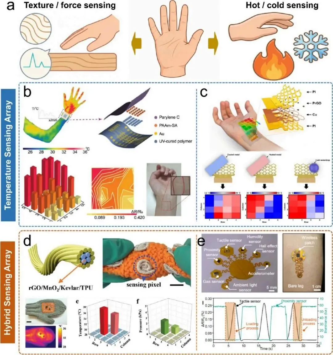 人体触觉感知本质上是多模态的,能够无缝融合力学信息与热刺激以解读环境。因此,开发媲美生物皮肤的电子皮肤需要有效整合温度传感与力学传感模态。然而,实现高保真多模态感知需克服热刺激与力学刺激引发的严重交叉敏感性和信号耦合问题,这要求技术从简单的物理堆叠转向复杂的结构和材料层面解耦策略。结构隔离是缓解干扰的主要策略之一,通过在像素间引入微间隙抑制热串扰,或采用蛇形互连设计减少拉伸对热信号的影响。材料内在解耦则通过特殊材料设计实现单一基底上多种刺激的同时检测,无需复杂的后处理算法。此外,领域正朝着异质系统集成方向发展,将触觉传感单元与湿度、霍尔效应、接近度、气体等多种传感器共集成于单一柔性印刷电路板,实现统一平台上的混合感知。3.4.2 植入式与在体传感