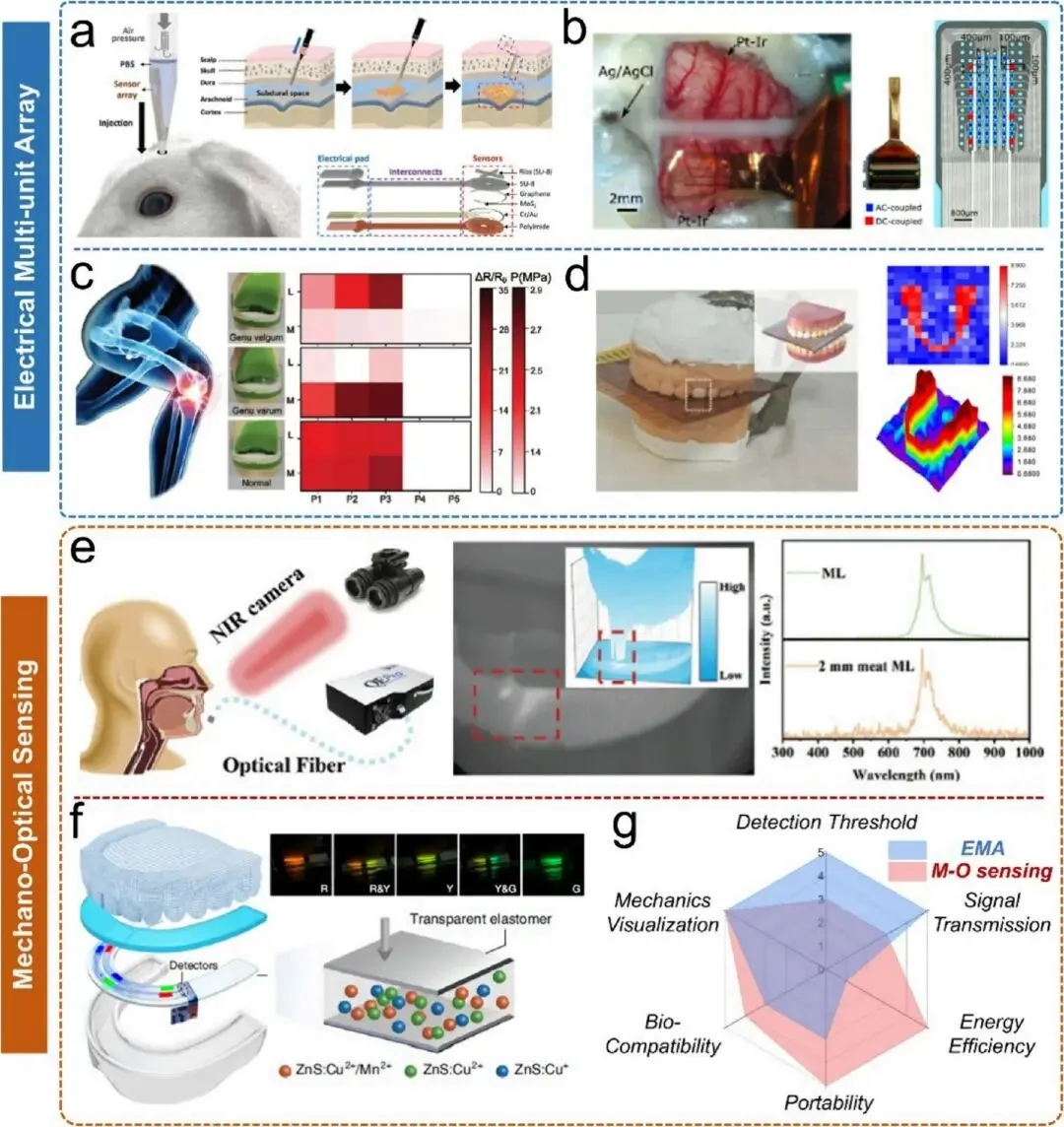FMM 的应用范围正从表面接触监测向更具挑战性的植入式和在体传感前沿扩展。与表皮电子设备不同,植入式器件必须承受腐蚀性生理环境,同时最大限度减少异物反应,其核心设计理念已从单纯提升灵敏度转向确保长期生物界面稳定性,并建立高效的无线数据和能量传输链路,消除易引发感染的经皮导线。对于 EMA,主要挑战在于刚性电子设备与柔软生物组织之间的机械失配,这通常会引发炎症和胶质瘢痕形成。为缓解这一问题,结构顺应性和微创递送至关重要。研究人员开发了可通过针头注射并在硬膜下空间自扩张的柔性网状系统,实现与脑表面的共形接触;通过将植入式柔性阵列与低噪声有源读出和无线传输集成,开发出可长期稳定工作的皮质表面成像平台。在骨科关节、口腔等高载荷环境中,传感器还需防止信号饱和并承受重复机械应力。此外,针对植入式设备的能量限制,研究人员开发了自供能摩擦电阵列,直接将静态和动态咬合事件转换为电信号热图。与 EMA 相比,MOS 引入近红外机械发光技术,完全消除直接物理接触和现场电子设备,在体内无线应力传感中展现出巨大潜力。3.4.3 迈向闭环 “感知 - 决策 - 执行” 触觉系统
