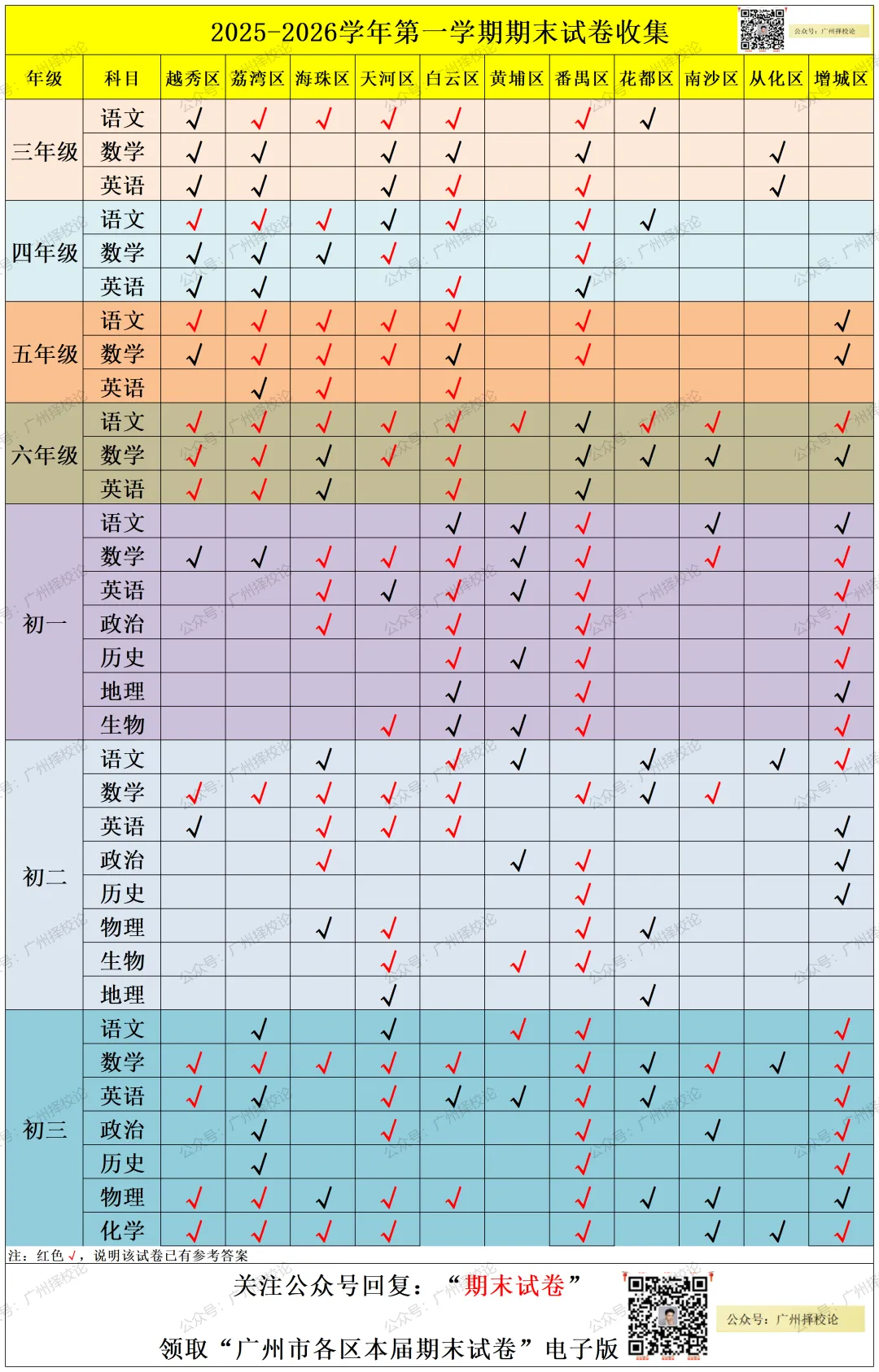 本学期小学、初中期末试卷及答案出炉!黄埔、越秀、荔湾、海珠、天河、白云、番禺、花都、增城、南沙、从化等持续更新中...