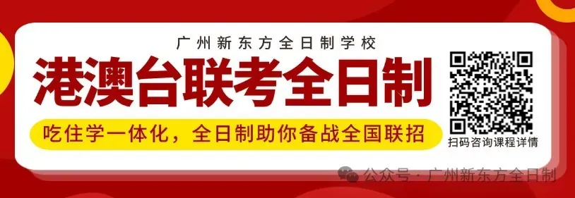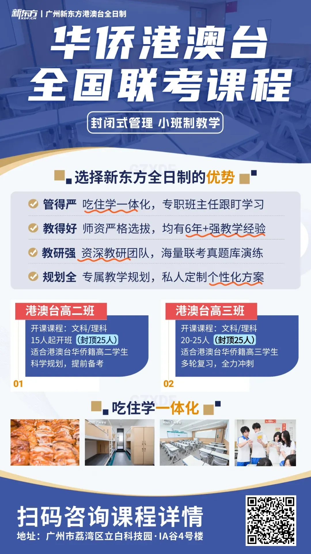 为帮助港澳台华侨籍考生精准备考,广州新东方全日制开设港澳台联考项目,学校面向全国招生。教研组专研港澳台联考历年真题进行独立教材编写,具有多年港澳台学科授课经验的老师负责教学。确保学子能全面迎战联考,突破重围。