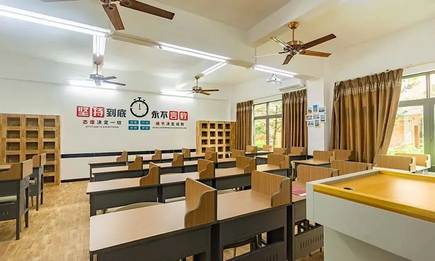 沉浸式智能教室:教室宽敞明亮,拥有智能多媒体黑板等现代化教学管理设备,空调冬暖夏凉。课桌配备独立隔板,学生学习更加专注高效。