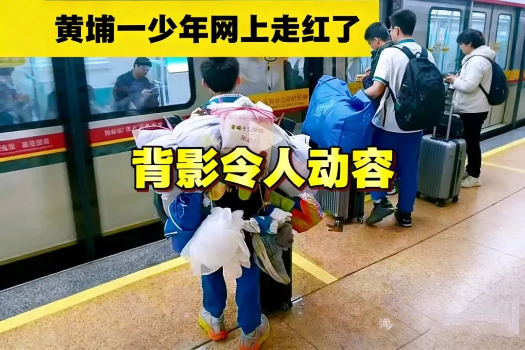 他肩上扛着的被褥捆得像座小山头,蛇皮袋里露出半截脸盆,书包带子勒得肩膀发红,却一步一顿地往车厢里挪。没有家长跟在身后,没有手机求助的慌张,只有校服后颈处那片被汗水浸湿的深色印记,在人群里晃得人眼睛发酸。