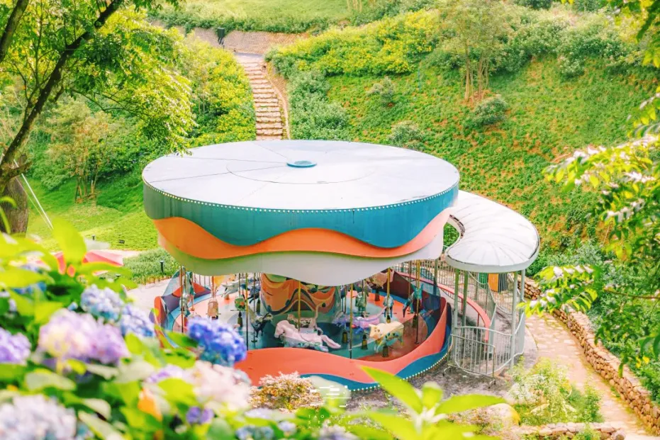 位于千红林深处,被山林、花海包围更具神秘色彩,木马以十二生肖为主题,还刻画着天人山水十二种代表花卉