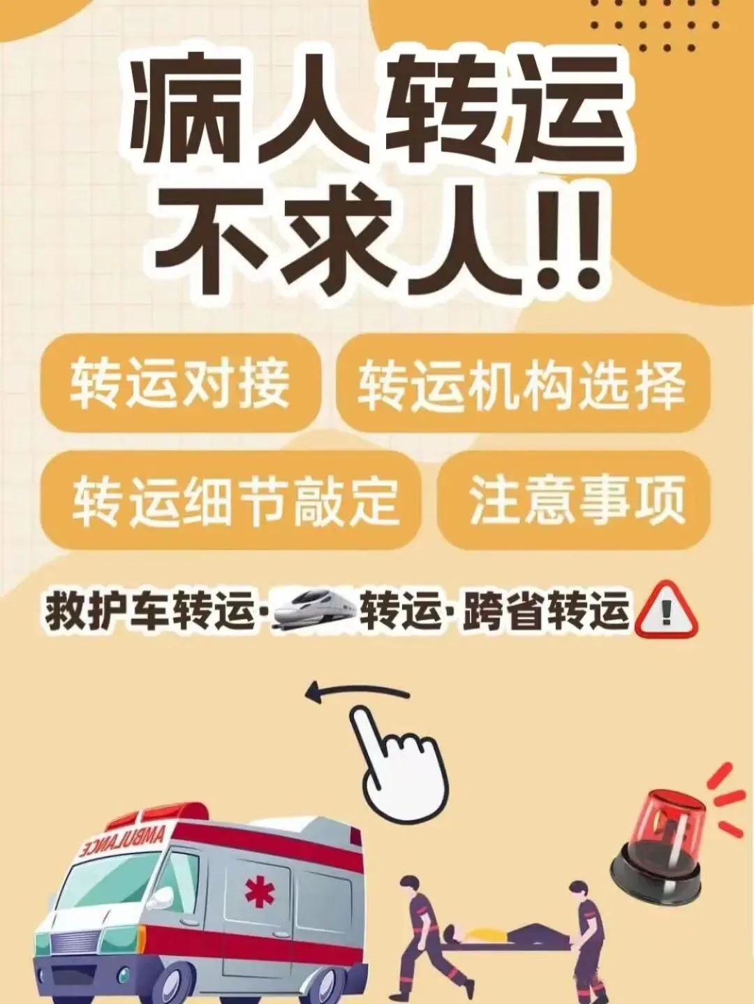 不管遇到什么情况,我们都会把病人放在第一位,我们的救护车司机熟悉路线,我们的转运也是非常迅速的,这是我们的优势。虽然我们的价格非常非常优惠了,但是我们的服务质量是不打折扣的。