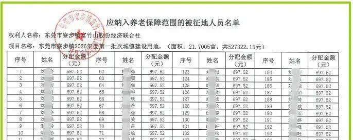 值得注意的是,本次征地社保费用按16.2万元/亩的15%计提,总额52.732215万元,将存入专门账户用于被征地农民养老保险补贴。方案公布了涉及756名村民的养老保障人员名单,每人可获得697.52元社保分配。
