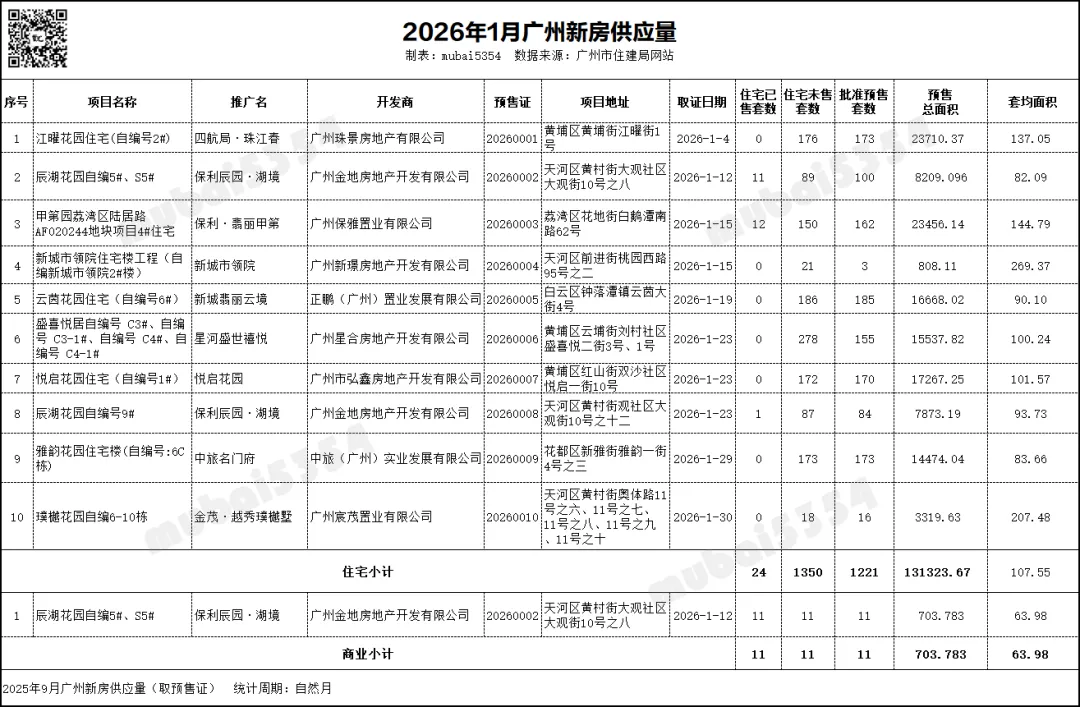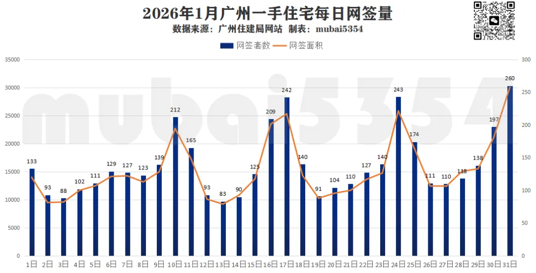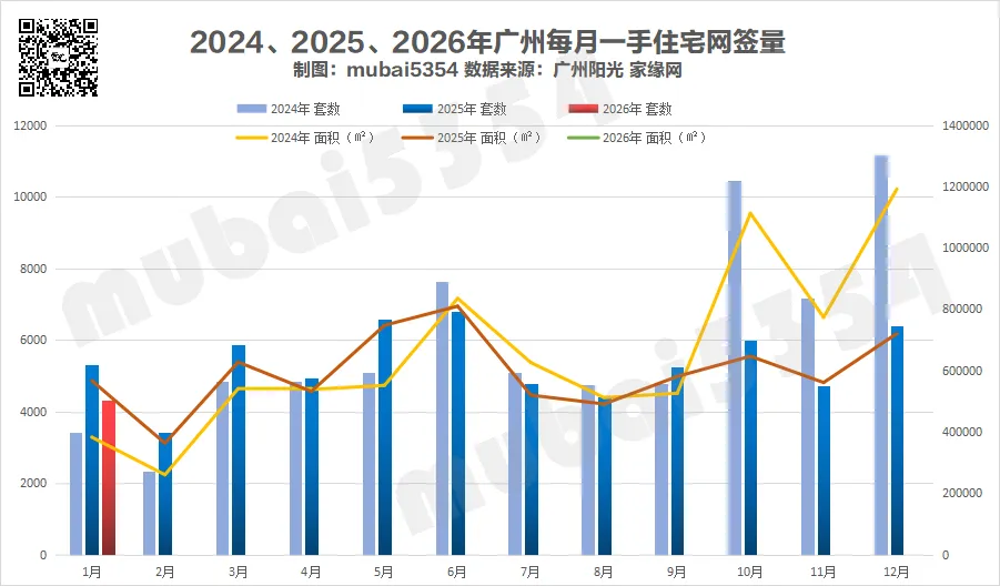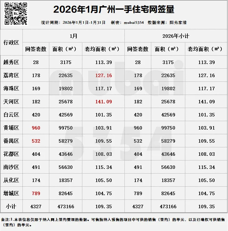 销售 根据阳光家缘公布的数据显示,2026年1月(统计周期:2026年1月1月日-2026年1月1日),广州一手住宅网签4327套,473166㎡,套均面积109.35㎡,比上一个统计周期减少2068套、246895平方米,环比分别下降32.34%和34.29%,同比分别下降18.42%和16.51%,套均面积比上个统计周期下降3.25平方米/套。