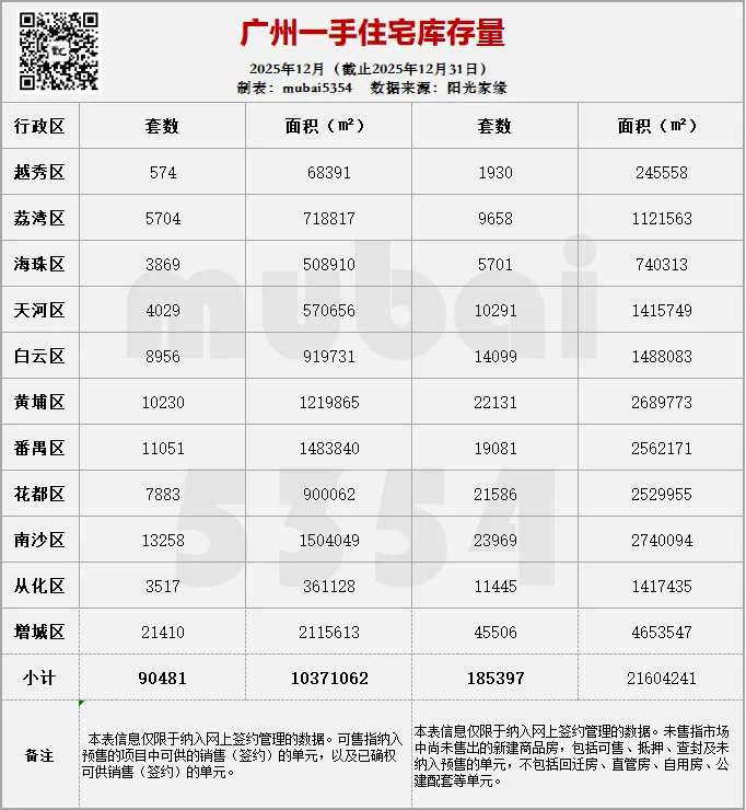 库存截至2026年1月31日,全市一手住宅库存90481套,10371062㎡;如含抵押、查封及未纳入预售的单元185397套,21604241㎡。