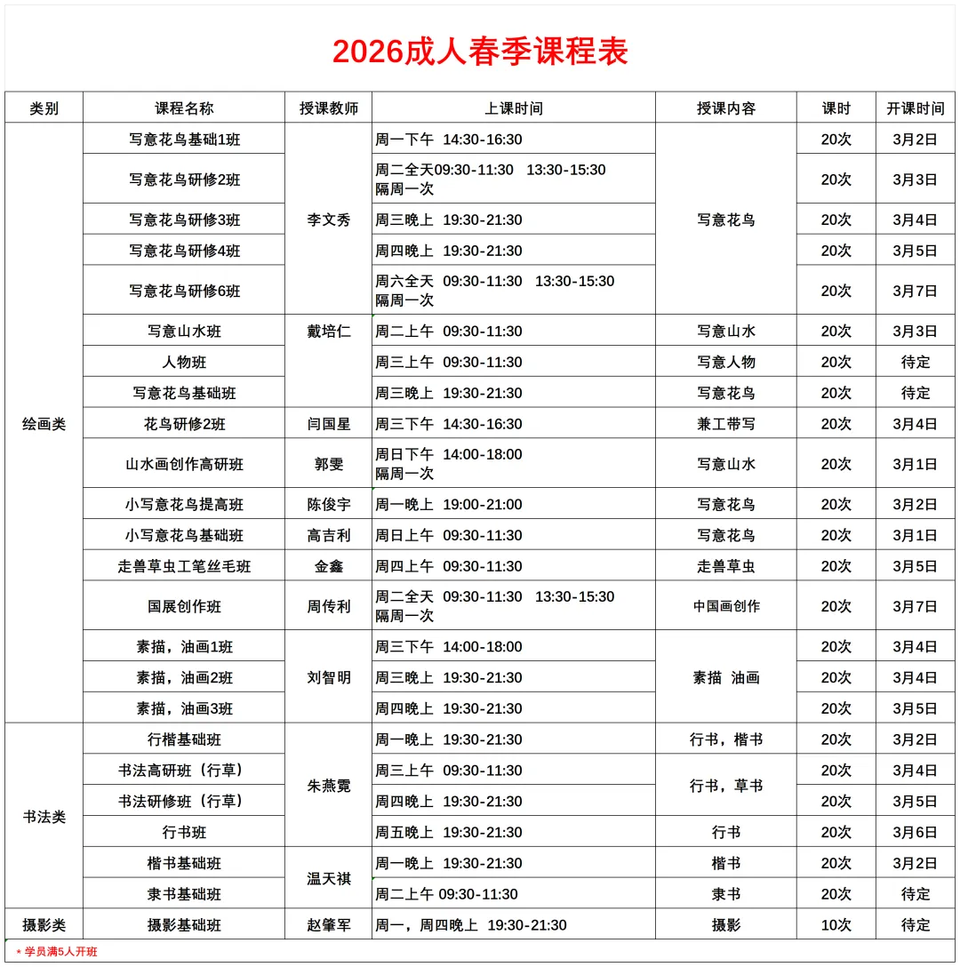 >深圳书画艺术院·2026年春季课程表