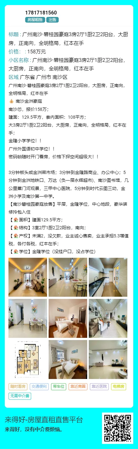 广州南沙·碧桂园豪庭3房2厅1厨2卫2阳台,大厨房,正南向,全明格局,红本在手大3房2厅1厨2卫2阳台,大厨房,正南向,全明格局,红本在手;3分钟板头或金洲菜市场;3分钟到金隆路商业、办公中心;5分钟到金洲地铁口、万达(负一层永辉超市)、南沙图书馆,几公里蕉门河观景,三甲中心医院,5分钟到时代云图三幼,金洲小学及南沙第一中学。【南沙碧桂园豪庭放售】平层,金隆学位,中心地段,豪华装修拎包入住【🏠产权】未满2,没欠款,业主诚心售卖,业主承担5.3增值税,各付各税,红本在手;广州南沙·碧桂园豪庭3房2厅1厨2卫2阳台,大厨房,正南向,全明格局,红本在手大3房2厅1厨2卫2阳台,大厨房,正南向,全明格局,红本在手;3分钟板头或金洲菜市场;3分钟到金隆路商业、办公中心;5分钟到金洲地铁口、万达(负一层永辉超市)、南沙图书馆,几公里蕉门河观景,三甲中心医院,5分钟到时代云图三幼,金洲小学及南沙第一中学。【南沙碧桂园豪庭放售】平层,金隆学位,中心地段,豪华装修拎包入住【🏠产权】未满2,没欠款,业主诚心售卖,业主承担5.3增值税,各付各税,红本在手;
