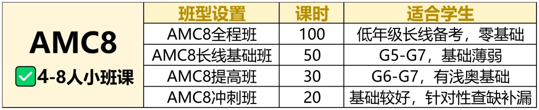 ✅ AMC8长线基础班(50h):夯实数论、几何等核心模块,适合首次参赛学生