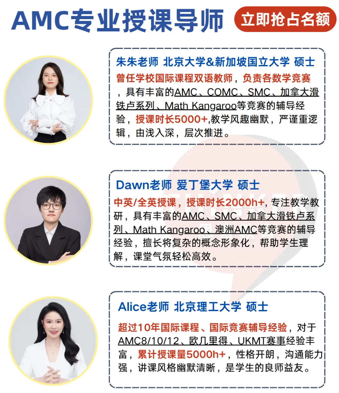 思客AMC导师团队来自:爱丁堡大学、新加坡国立、帝国理工、清华、北大等名校,他们多年AMC竞赛教学经验,熟悉出题规律与得分技巧,带你一步步拆解AMC真题逻辑,掌握竞赛思维!