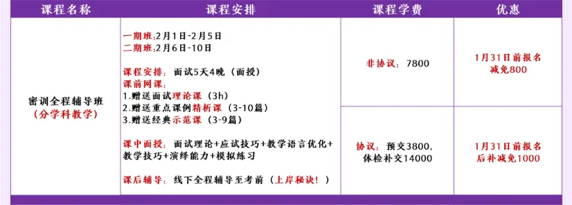 (1)课程内容:5天4晚试讲面试班(分学科授课,小班教学)