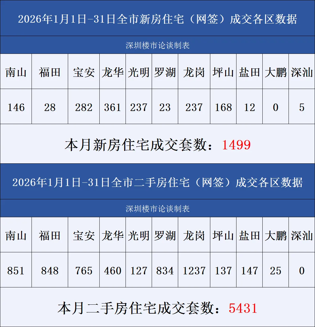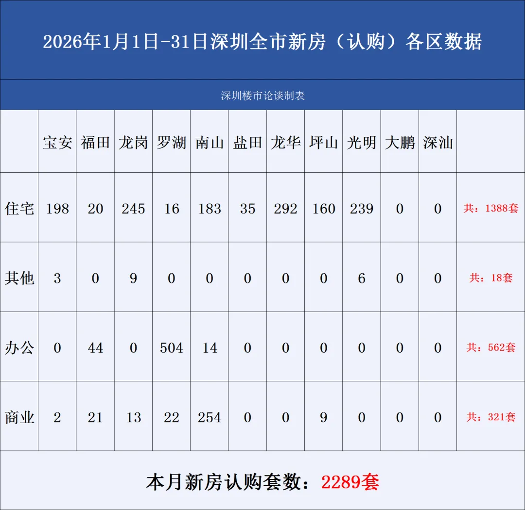 各位朋友,我们来看刚出炉的2026年1月深圳楼市网签数据!