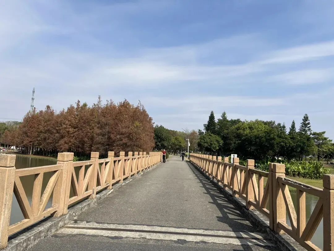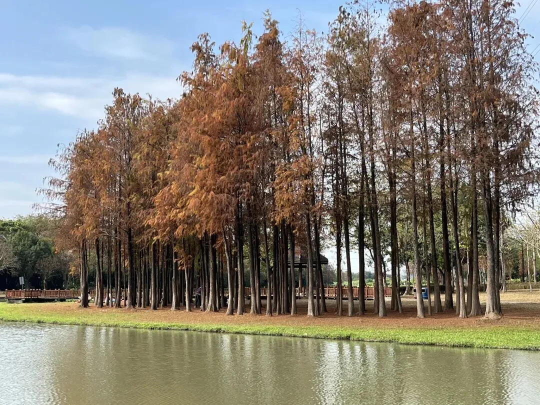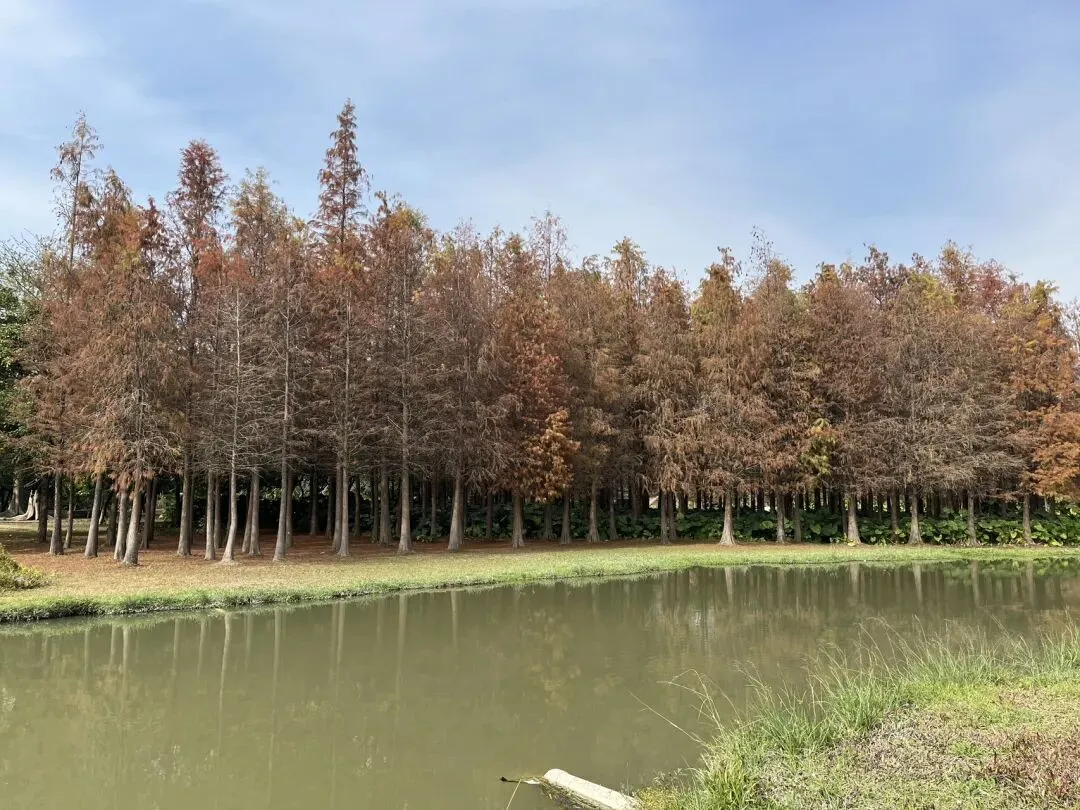刚走进园区,就被扑面而来的清新空气治愈。沿着原木栈道往里走,视野一下子就开阔起来——大片湖面映入眼帘,对岸的落羽杉林早已换上冬日盛装,深橙、浅红、褐黄交织在一起,层层叠叠的枝叶在阳光下泛着温柔的光泽,像被大自然精心勾勒的油画,美得让人挪不开眼。