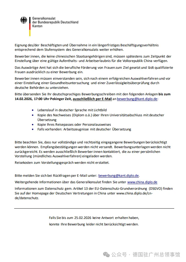 📢 德国驻广州总领事馆拟于2026年4月1起招聘签证处工作人员(全职,有限期)。