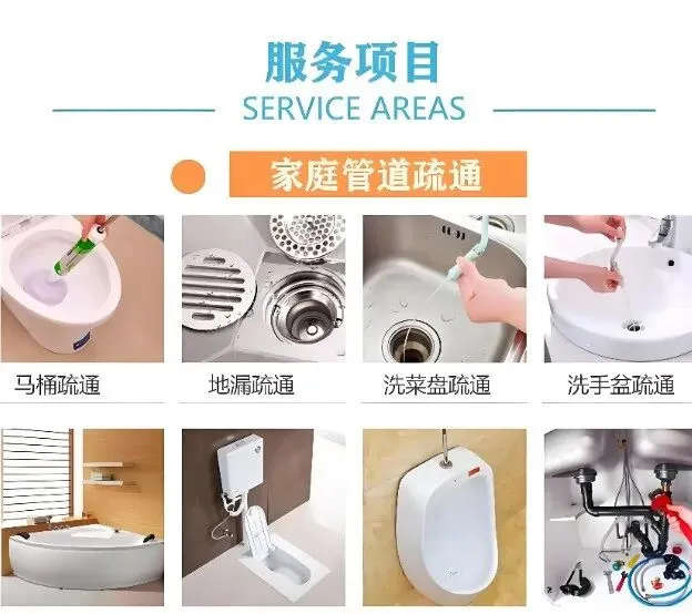 管道疏通:使用专业疏通设备,疏通各类疑难下水道、卫生间、地漏、浴缸、菜池、马桶、蹲坑等。