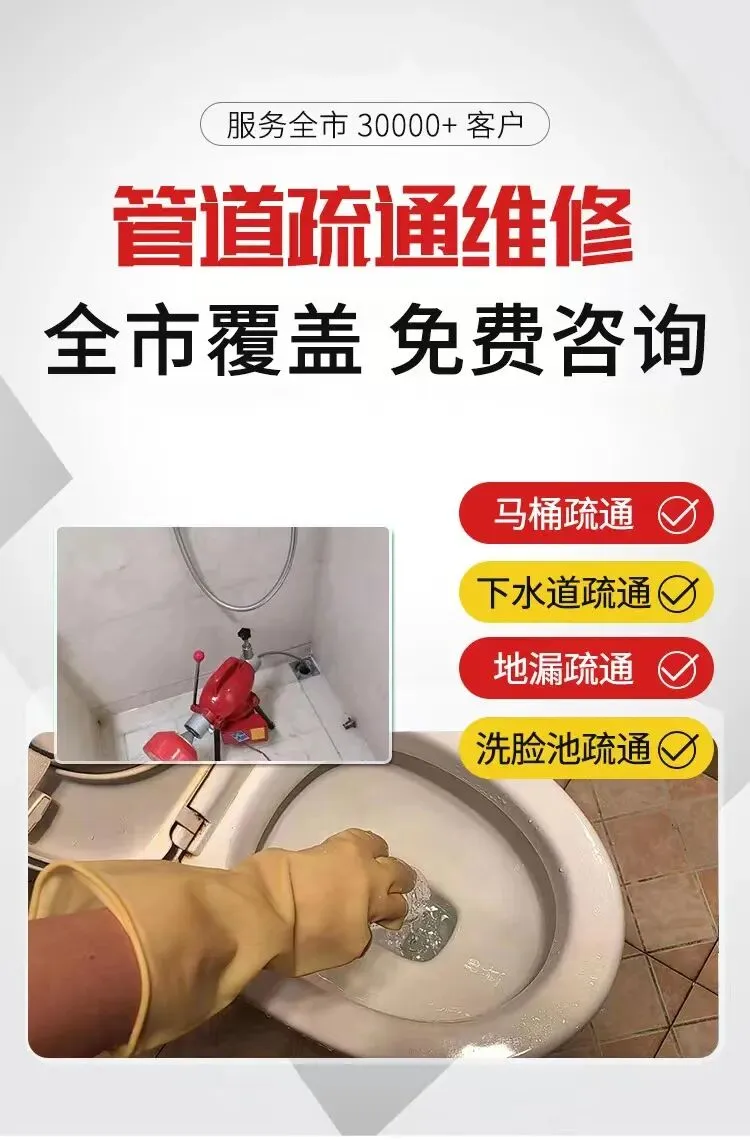 管道疏通:使用家用疏通机、大型疏通机等设备,专业疏通各类疑难下水道、卫生间、地漏、浴缸、菜池、阴沟、马桶、蹲坑等