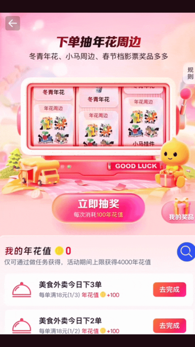 即日起至2月28日,广州、佛山、深圳、东莞地区的街坊,在淘宝闪购搜索「广东年花」,点外卖单笔实付满18元即可参与抽奖,把「好意头」提前带回家!