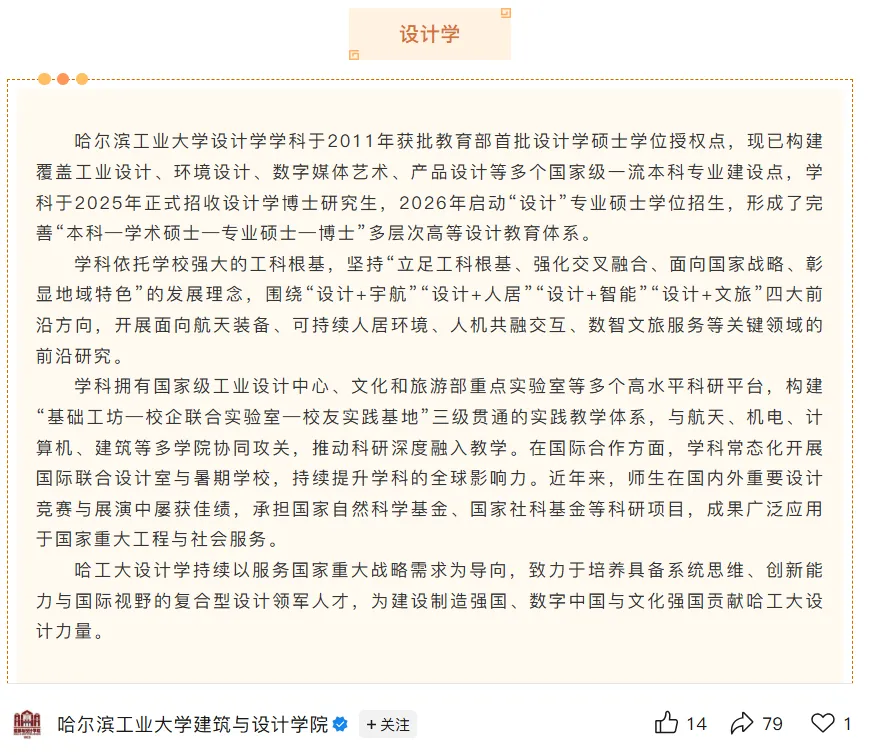哈工大工科底蕴深厚,在智能科技、工程技术、城乡规划等领域实力顶尖,为设计提供技术落地能力。