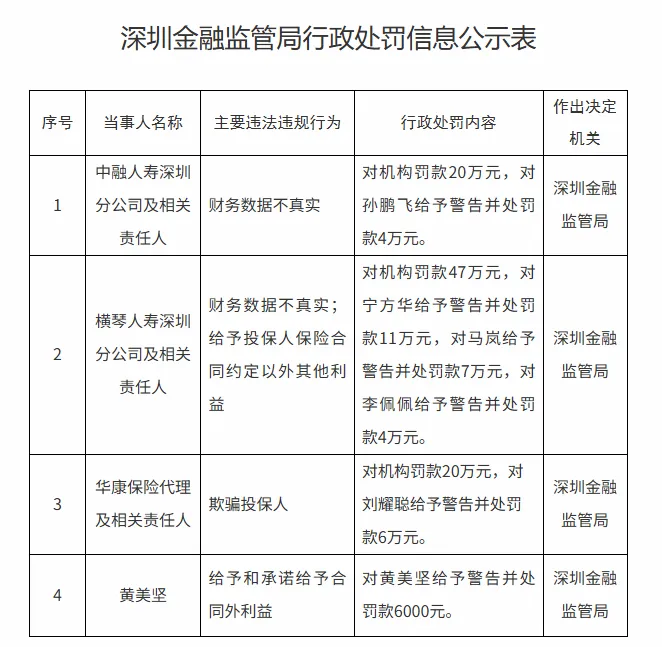 中融人寿深圳分公司因“财务数据不真实”被罚款20万元,并对孙鹏飞给予警告和处罚款4万元。