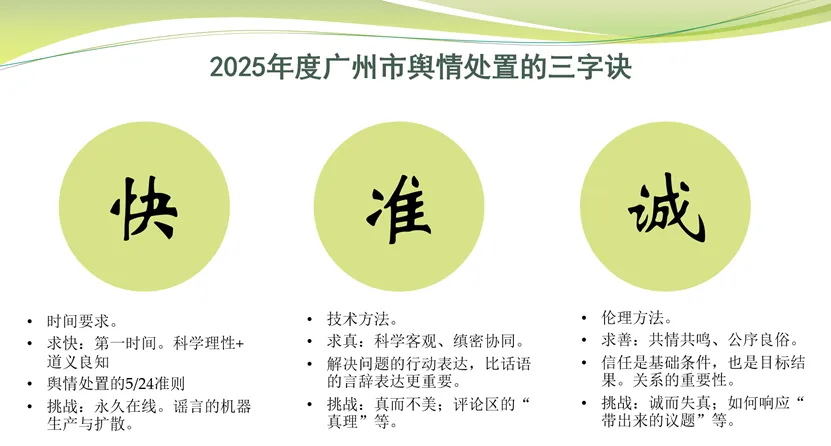 我详细地看了一下2025年的典型案例。我理解,2025年广州市网络舆情应对和处置有三个特点:快、准、诚。我想可以称之为广州网络舆情处置的三字诀。