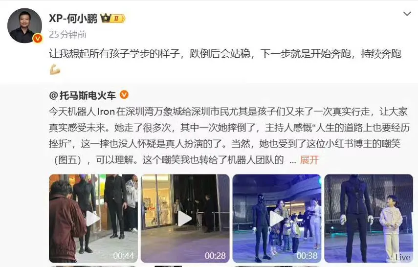 小鹏汽车副总裁 @托马斯电火车称,机器人IRON在深圳湾万象城给深圳市民尤其是孩子们又来了一次真实行走,让大家真实感受未来。她走了很多次,其中一次她摔倒了,主持人感慨“人生的道路上也要经历挫折”,这一摔也没人怀疑是真人扮演的了。