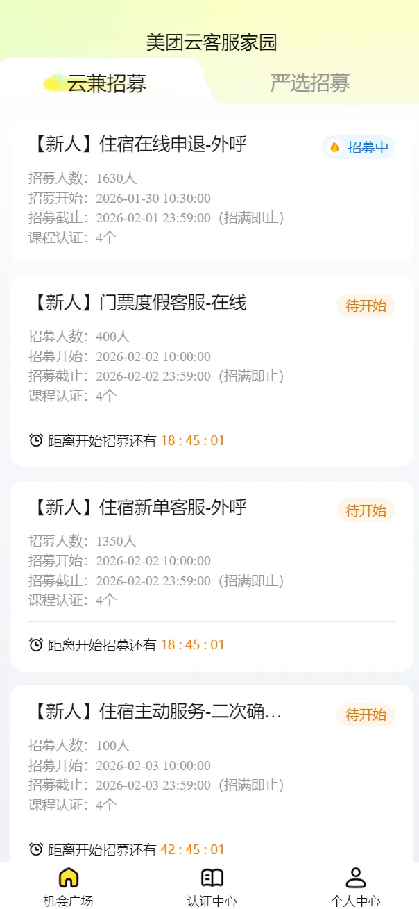 美团云客服小程序,报名前需按照要求完成前置课程学习。扫描下方二维码,关注【本地宝深圳招聘】公众号,回复【美团】,即可直达美团云客服兼职报名页面,获取兼职岗位最新消息、查看报名常见问答,还可以持续获取美团社招、校招投递入口哦
