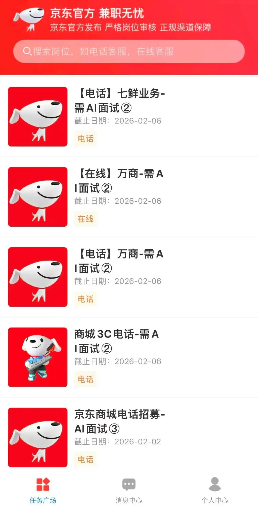 招募的岗位有【在线】店铺居家客服、外卖调研服务岗、【在线】京东商城招募、【在线】外卖居家客服、【电话】七鲜在线、万商电话业务、万商在线、京东商城电话招募、京东商城表单外呼、商城3C电话等,部分岗位展示如下图所示
